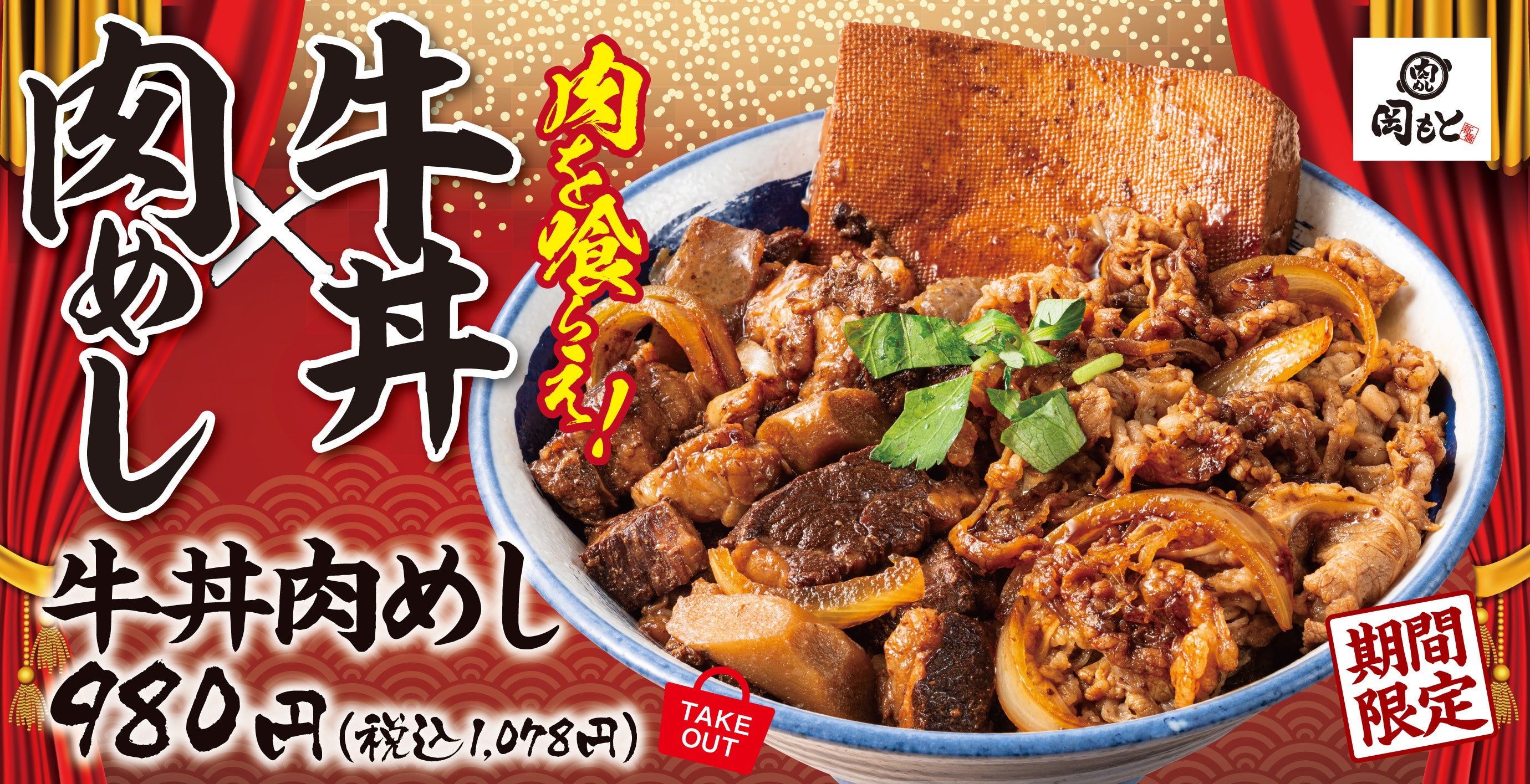 『牛丼肉めし』は、肉めし岡もと不動の看板メニュー「肉めし」と、丼の定番メニューとして親しまれている「牛丼」を、一杯で同時に楽しめるメニューとして開発しました。