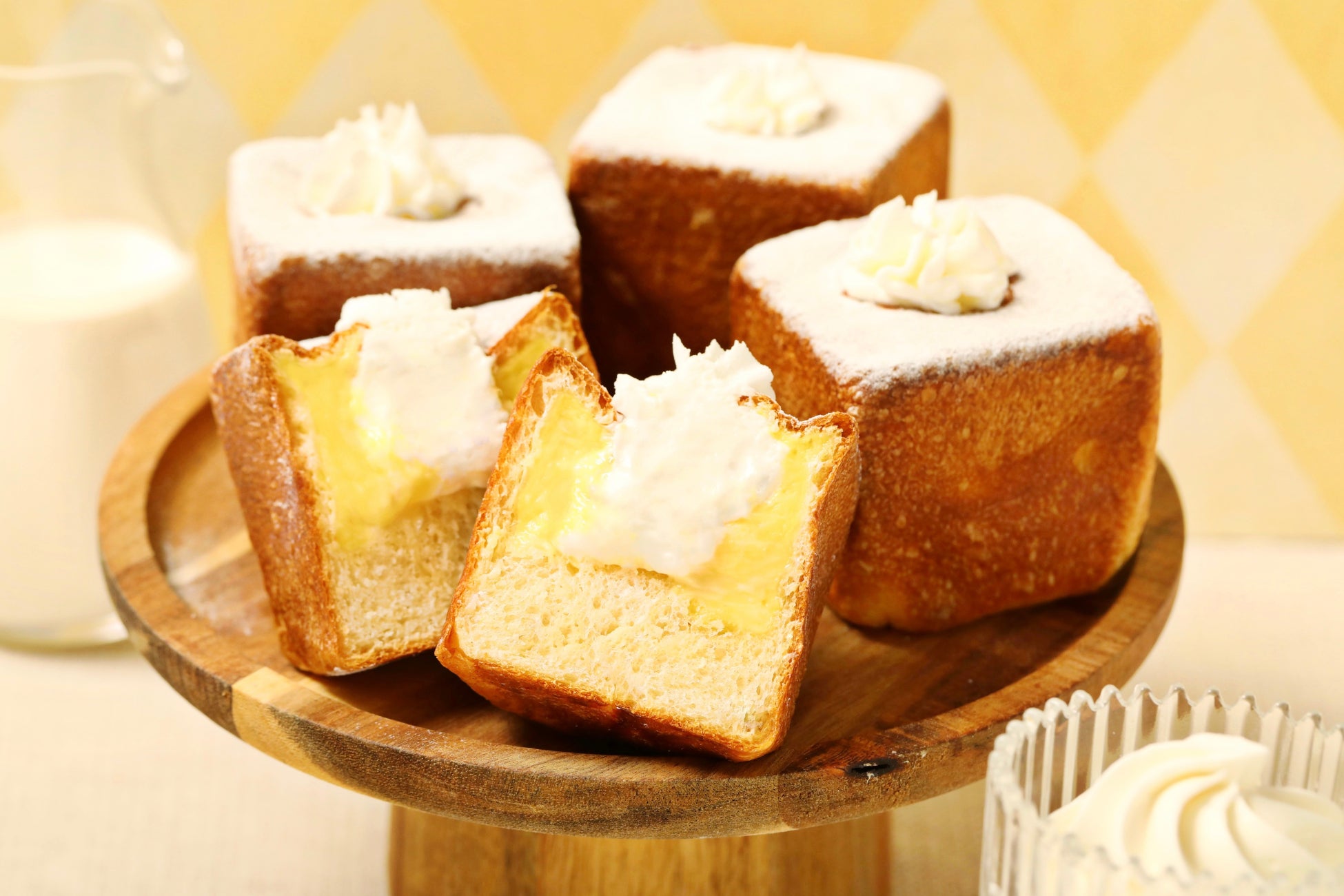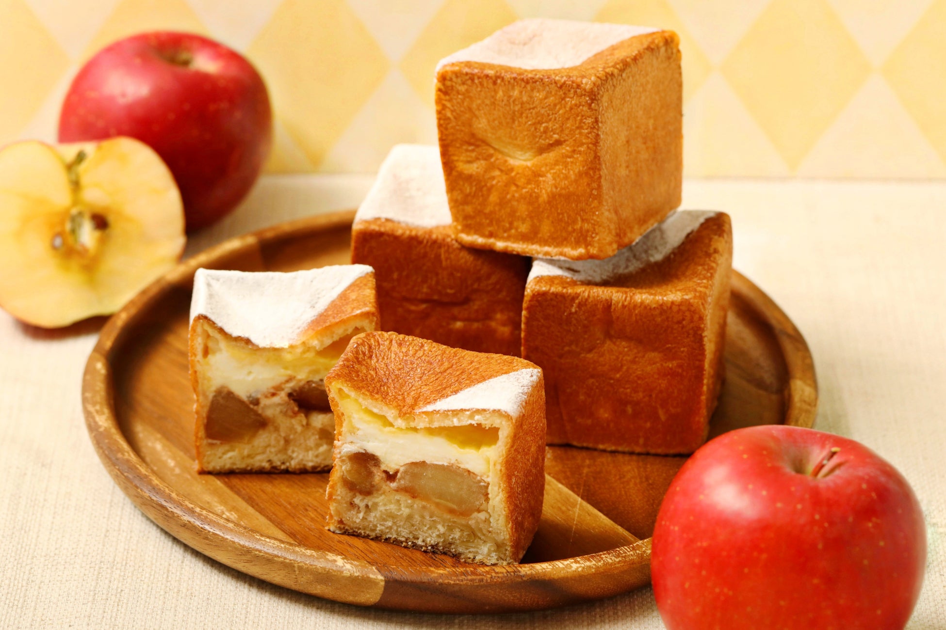 また、用賀店では新デザイン店舗限定商品として、キューブクリームパン全2品を新発売。カスタードクリームとホイップクリームをぎゅっと詰め込んだ『ふわとろWクリームパン』と、りんごの食感とシナモンの香りをお楽しみいただける『ごろっとりんごのクリームパン』をご用意しました。