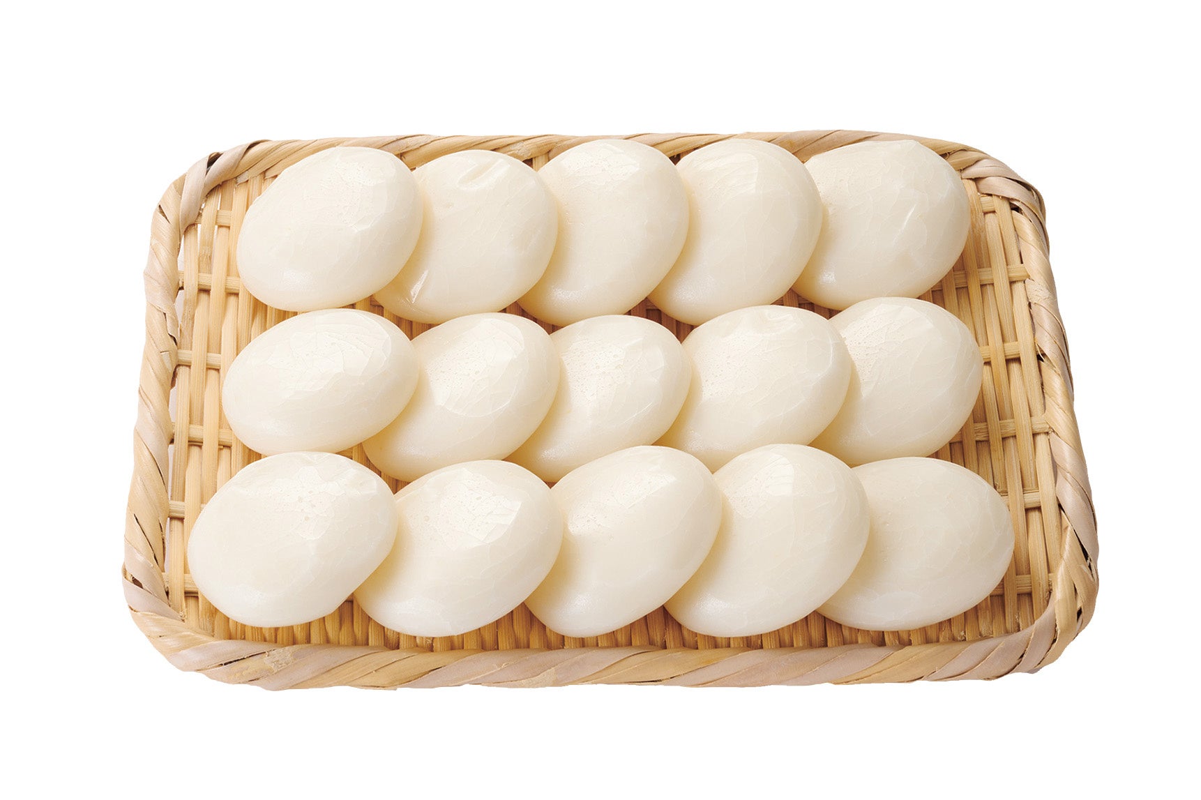 本品は、コシが強くキメが細かい、なめらかな食感が特徴の山形県産のもち米「でわのもち」のみを使用しています。「でわのもち」は、栽培の難しさから山形県庄内地域以外では作付けが少なく、市場流通が少ない希少な品種です。本品は蒸したもち米を杵と臼でつく伝統製法で、なめらかでよく伸びコシのある食感を実現しました。1個あたり約34g、直径5cmの平たい丸もちが1袋に約15個入っています。