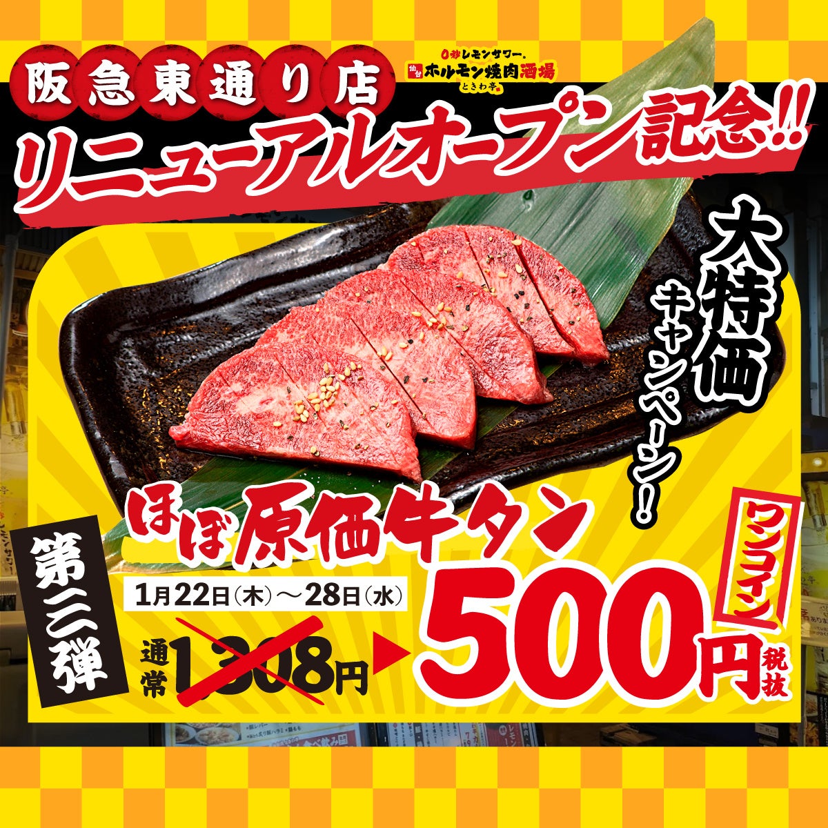 当店は、2021年3月にオープンし、これまで多くの方に愛顧いただいてきました。2026年1月8日(木)にリニューアルオープンします。リニューアルを記念し、3週連続でお得なキャンペーンを開催します。第一弾は、1月8日(木)から1月14日(水)まで、ときわ亭名物「仙台塩ホルモン」を29円(税抜)で提供。第二弾は、1月15日(木)から1月21日(水)まで、「黒毛和牛上カルビ」をほぼ原価の500円(税抜)でお楽しみいただけます。さらに、第三弾は1月22日(木)から1月28日(水)まで、「ときわ亭牛タン」をほぼ原価の500円(税抜)で提供いたします。