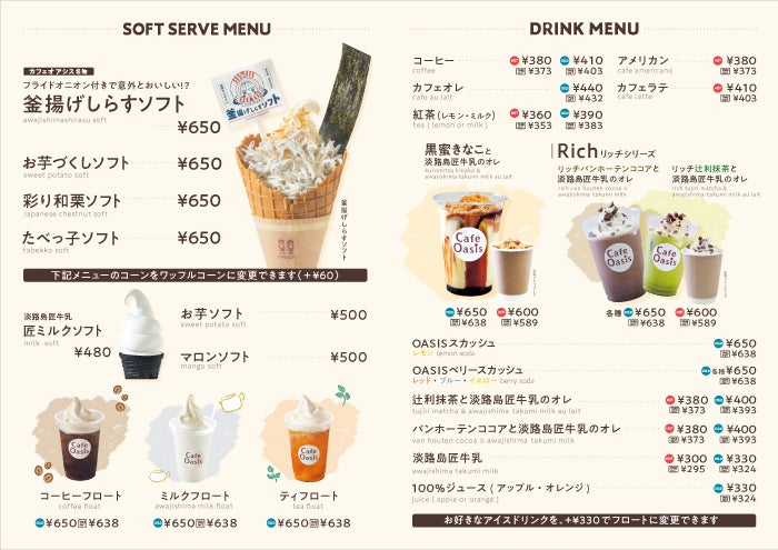 淡路島の玄関口に位置し、明石海峡大橋を眺めながら旬の食材を味わえるレストランや、特産品のショッピングを楽しめる淡路ハイウェイオアシス(運営:ユーアールエー株式会社/本社所在地:兵庫県淡路市大磯)の、「カフェオアシス」(オアシス館内1F)が、ソフトクリームの形状・内容をリニューアル!!年末年始の運転休みのひとときを当カフェでお過ごしください。