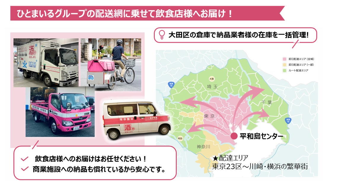 大田区平和島にある約7,000坪の倉庫で在庫を一括管理し、毛細血管のように張り巡らせた約250の拠点より、東京23区等へ「即日・最短1時間での配達」というきめ細やかな配達サービスを提供しております。