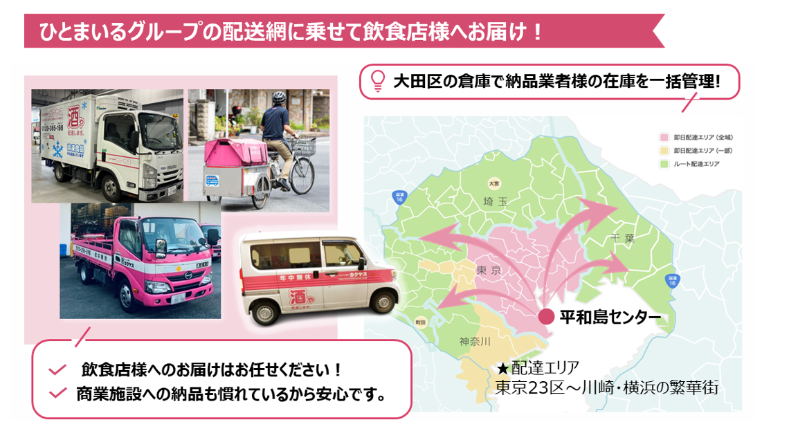 大田区平和島にある約7,000坪の倉庫で在庫を一括管理し、毛細血管のように張り巡らせた約250の拠点より、東京23区等へ「即日・最短1時間での配達」というきめ細やかな配達サービスを提供しております。
