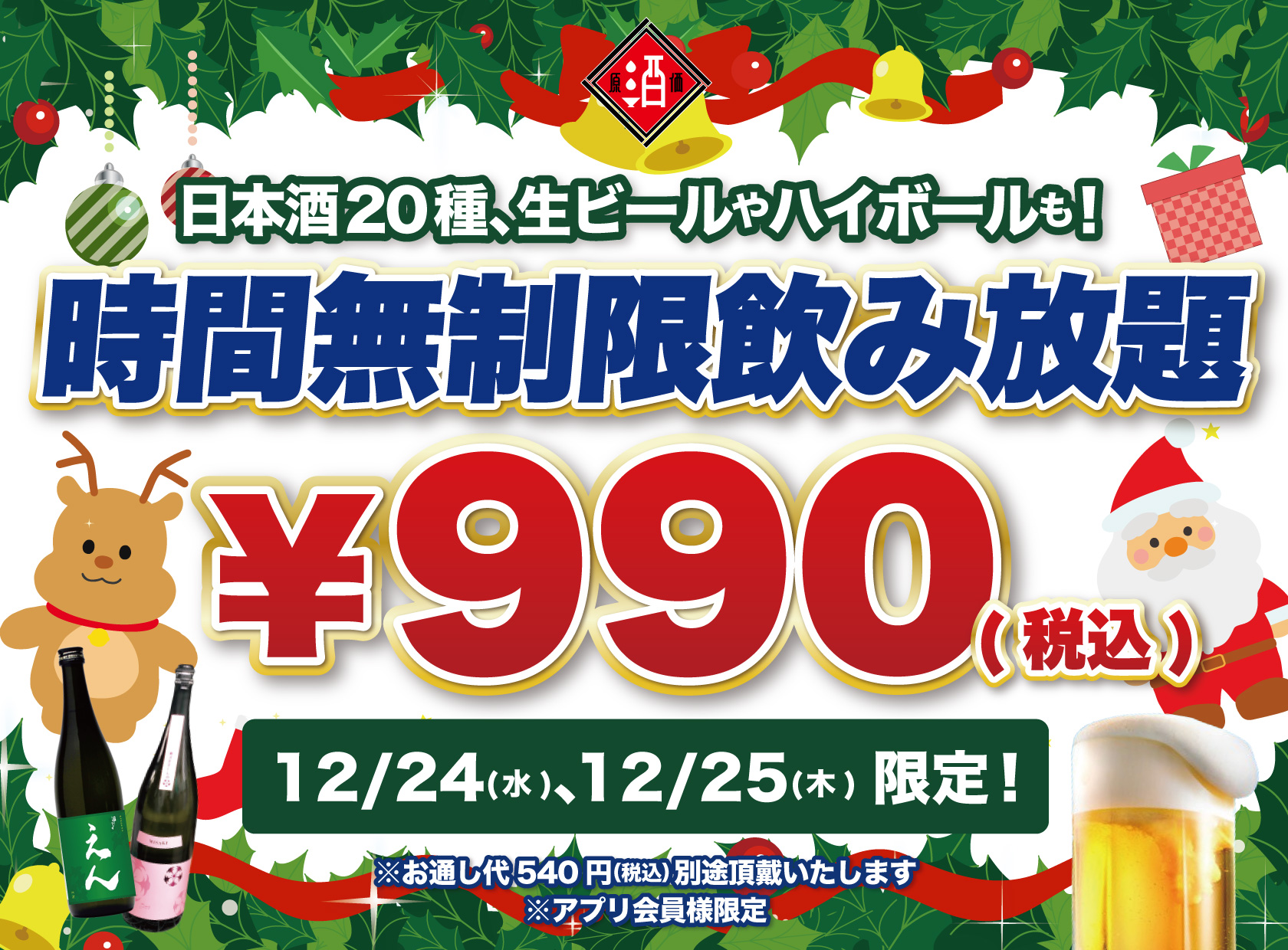 クリスマス2日間限定、時間無制限飲み放題 ¥990(税込)!