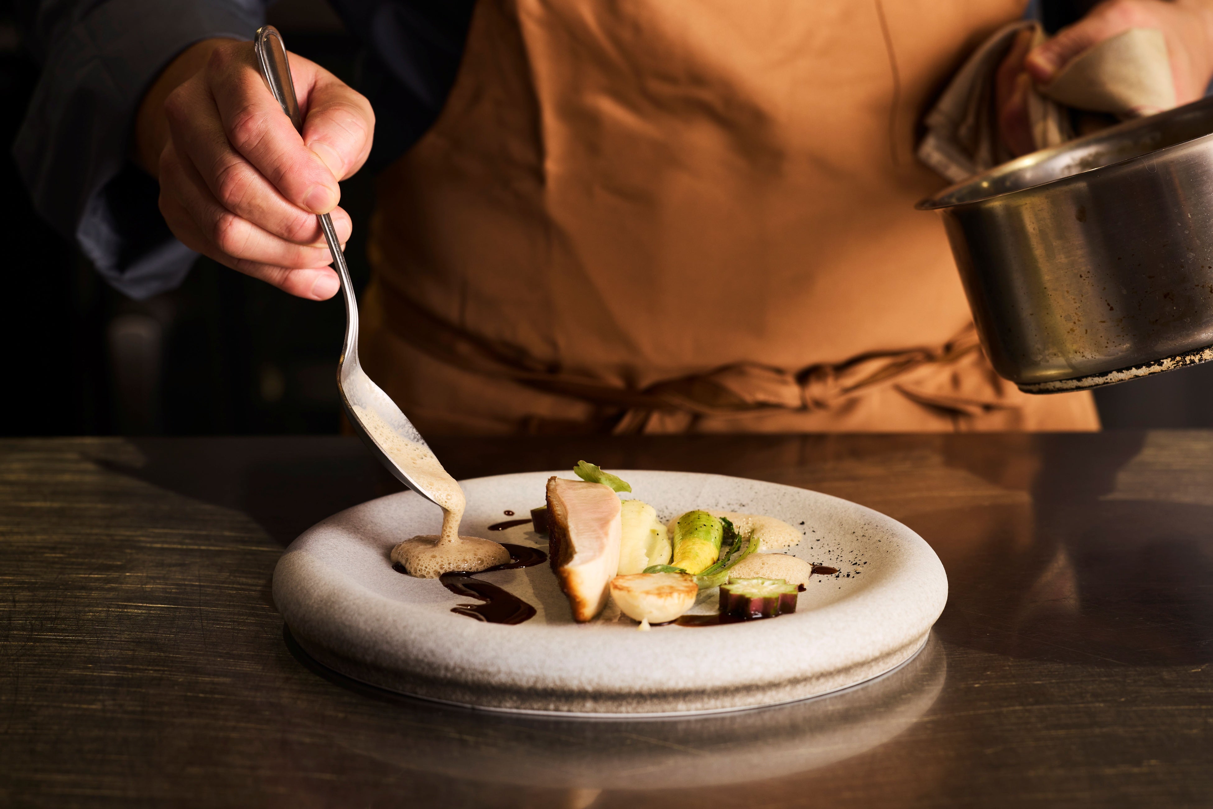 岡山で生まれ育ち、地元の調理師学校を卒業後、ウェスティンホテル淡路でキャリアをスタート。神戸北野ホテルでクラシックフレンチを学び、南仏ニームの「Jérôme Nutile」(ミシュラン一つ星)では、MOFシェフから、素材を生かし現代的かつ精緻に仕立てる最先端の技術を習得しました。帰国後は東京「L’ARGENT」(ミシュラン一つ星)でガストロノミーの現場を経験。料理に真摯に向き合い、素材選びから皿の仕上げまで、ひとつひとつに心を込めます。