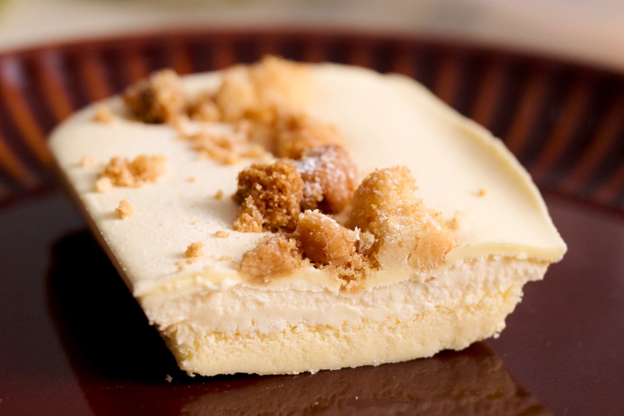 クリームチーズのコクを感じるベイクド層と、やわらかなマスカルポーネのムース層を重ねた2種のチーズを使用した2層のチーズケーキです。クッキークランチの食感をアクセントに、冷蔵では濃厚に、半解凍ではさっぱりとした口あたりを楽しめます。