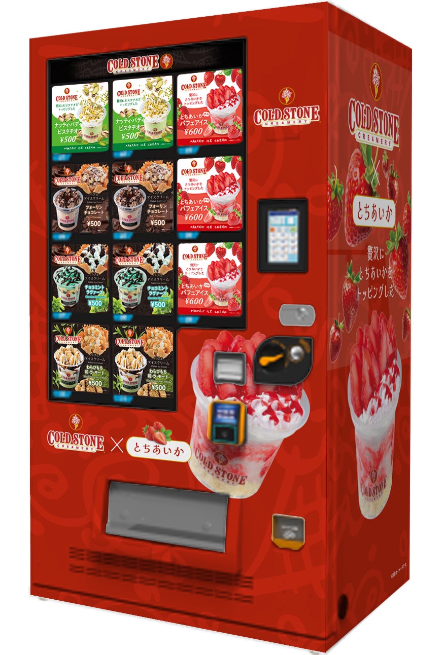 発売を記念して、【E4】東北自動車道 上河内(SA)上り線・佐野サービスエリア(SA)下り線では、「コールドストーン パフェアイスクリーム」の自動販売機が期間限定で“とちあいかの上品な赤”をイメージしたオリジナルデザインに!思わず写真を撮りたくなるラッピングで、サービスエリアに立ち寄る楽しみが更に広がります。