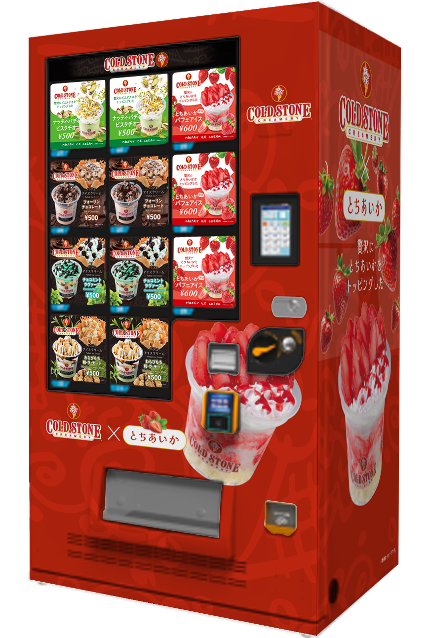 発売を記念して、【E4】東北自動車道 上河内(SA)上り線・佐野サービスエリア(SA)下り線では、「コールドストーン パフェアイスクリーム」の自動販売機が期間限定で“とちあいかの上品な赤”をイメージしたオリジナルデザインに!思わず写真を撮りたくなるラッピングで、サービスエリアに立ち寄る楽しみが更に広がります。