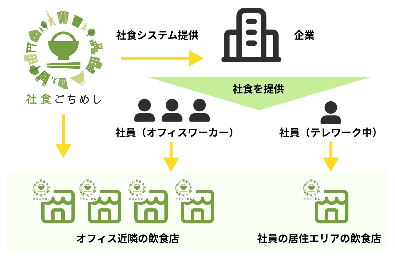 「社食ごちめし」は、企業が福利厚生として従業員に食事補助を提供できる法人向けサービスです。出社・リモートワークなど多様な働き方に対応しながら、従業員の日常的な食事を通じた生活支援を実現します。