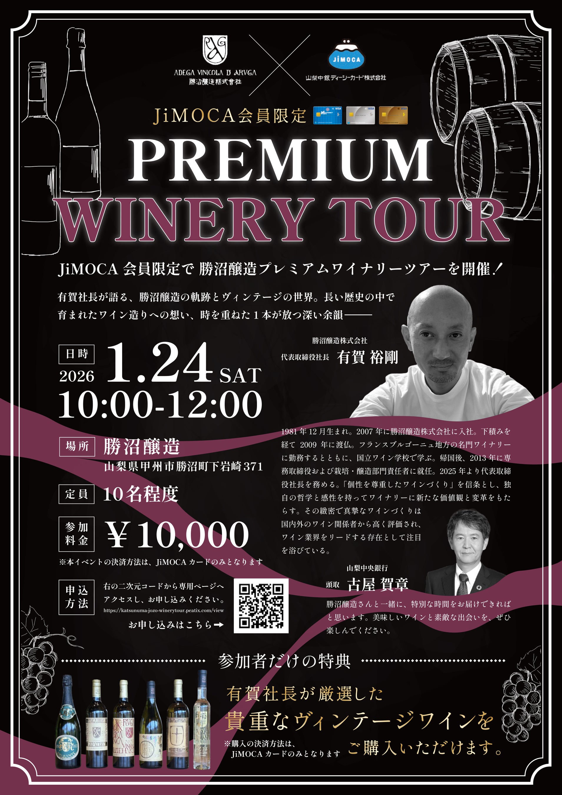 本キャンペーンは、日本が世界に誇るワインブランド「アルガ」シリーズを提供する勝沼醸造において、代表者によるヴィンテージワインの解説と、秘蔵されるプレミアムヴィンテージワインをJiMOCAの会員にご購入いただけるものです。
