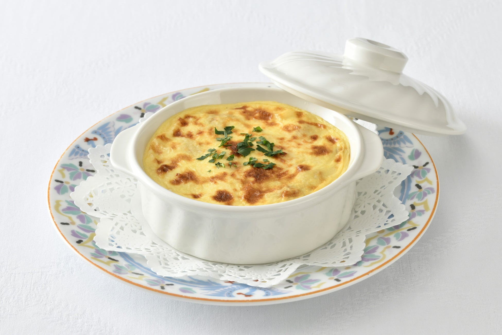 初代総料理長サリー・ワイルが、当時ホテルに滞在をしていたお客様から、体調を崩したので何かのど越し良いものを、というリクエストに応え、即興で創作した一品。バターライスに海老のクリーム煮、グラタンソースの3層が織りなすクリーミーで甲殻類の風味がたっぷり詰まった優しい味わいです。エビや帆立など、たっぷり入った具材も魅力です。