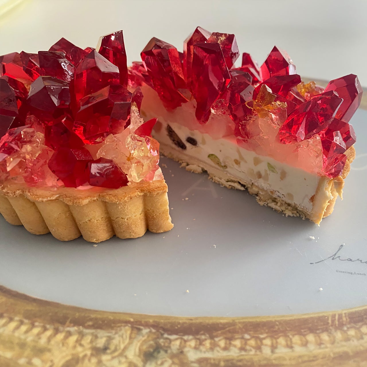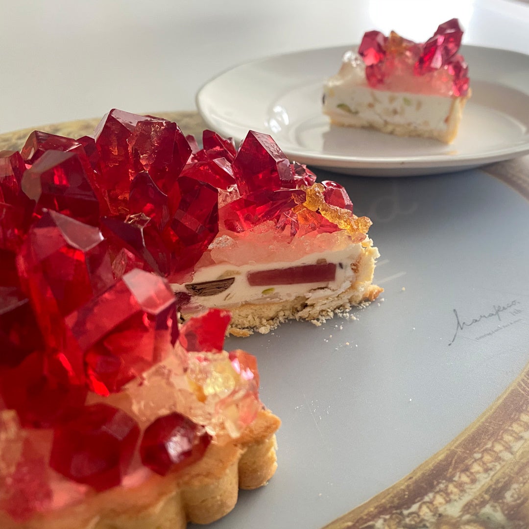 毎月販売開始すぐに完売する人気商品誕生石のタルトに、1月限定バージョンが登場。赤が印象的な1月の誕生石ガーネットを、カシス味のこうぶつヲカシでダイナミックにあしらい、まるで本物の鉱物のように仕上げました。ひとつひとつ、職人の手によって丁寧に切り出される琥珀糖の“切りたての輝き”は、このタルトならではの特別な魅力。大切な人への贈り物にはもちろん、1年を頑張った自分へのご褒美にもふさわしい、特別な一品に仕上がりました。