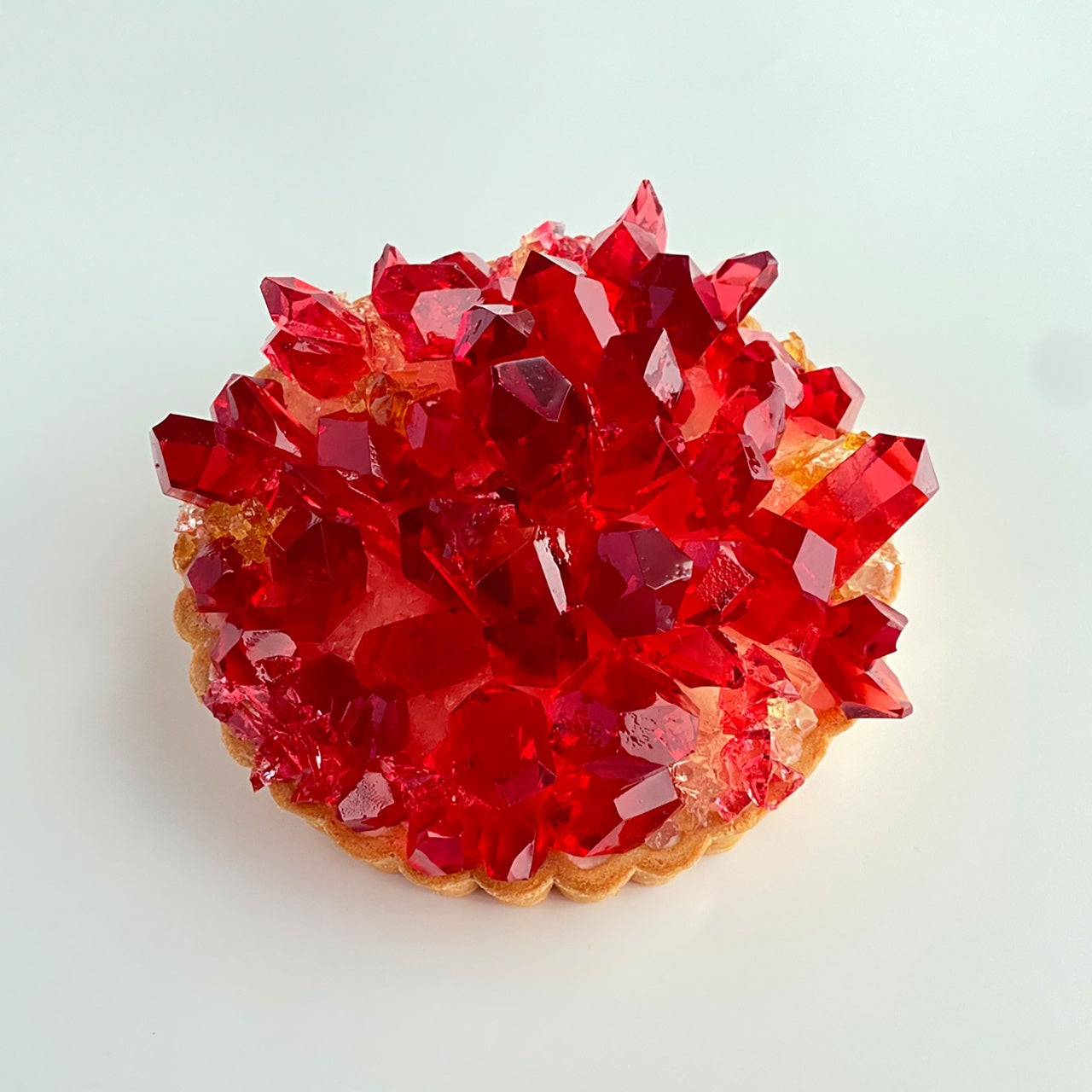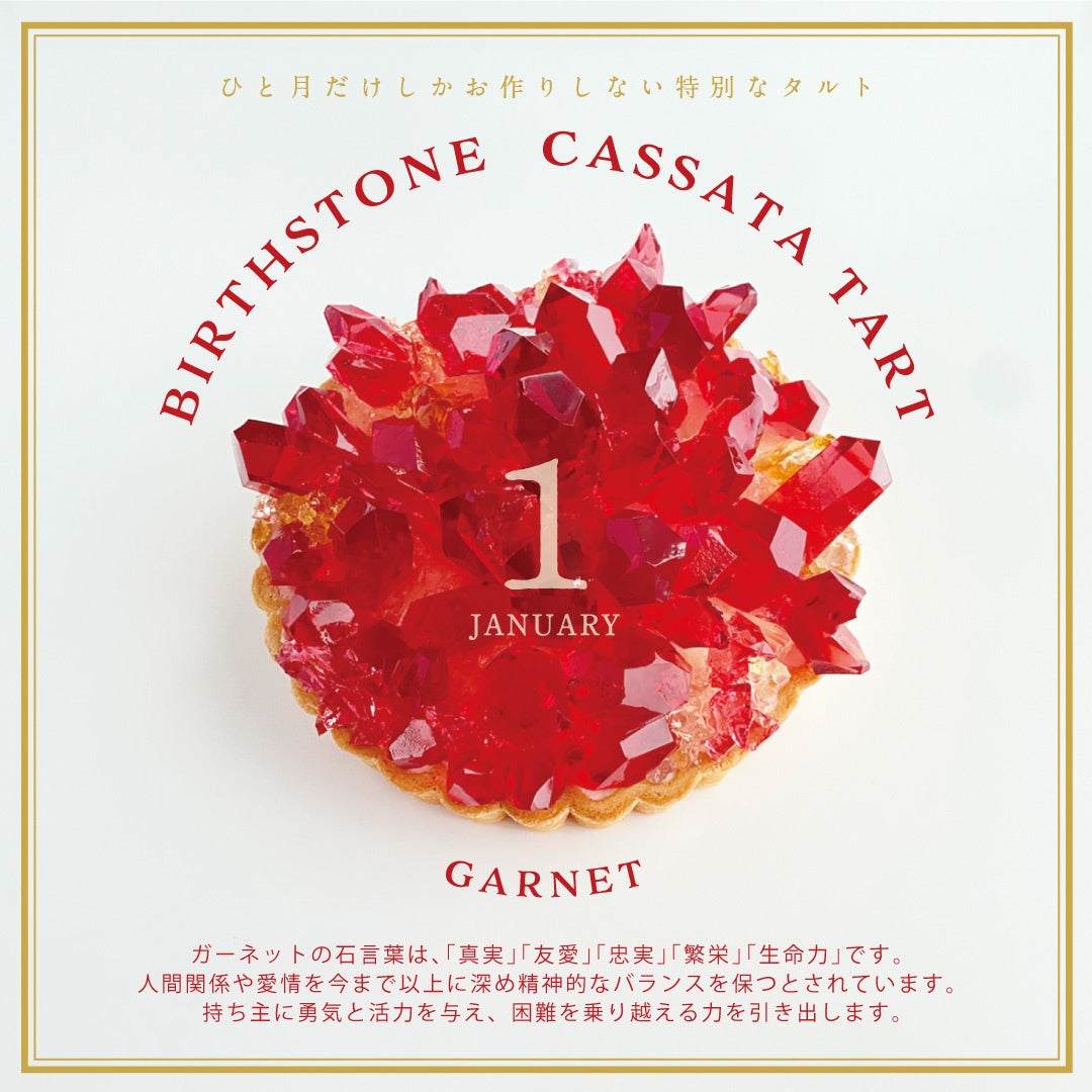 毎月販売開始すぐに完売する人気商品誕生石のタルトに、1月限定バージョンが登場。赤が印象的な1月の誕生石ガーネットを、カシス味のこうぶつヲカシでダイナミックにあしらい、まるで本物の鉱物のように仕上げました。ひとつひとつ、職人の手によって丁寧に切り出される琥珀糖の“切りたての輝き”は、このタルトならではの特別な魅力。大切な人への贈り物にはもちろん、1年を頑張った自分へのご褒美にもふさわしい、特別な一品に仕上がりました。