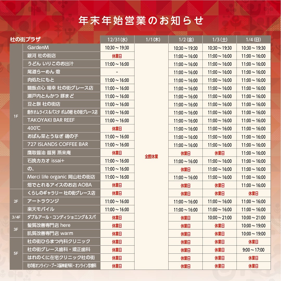 詳しくは以下の「年末年始営業のお知らせ」また、杜の街グレース公式HP(https://www.morinomachi-grace.jp/) をご確認ください。