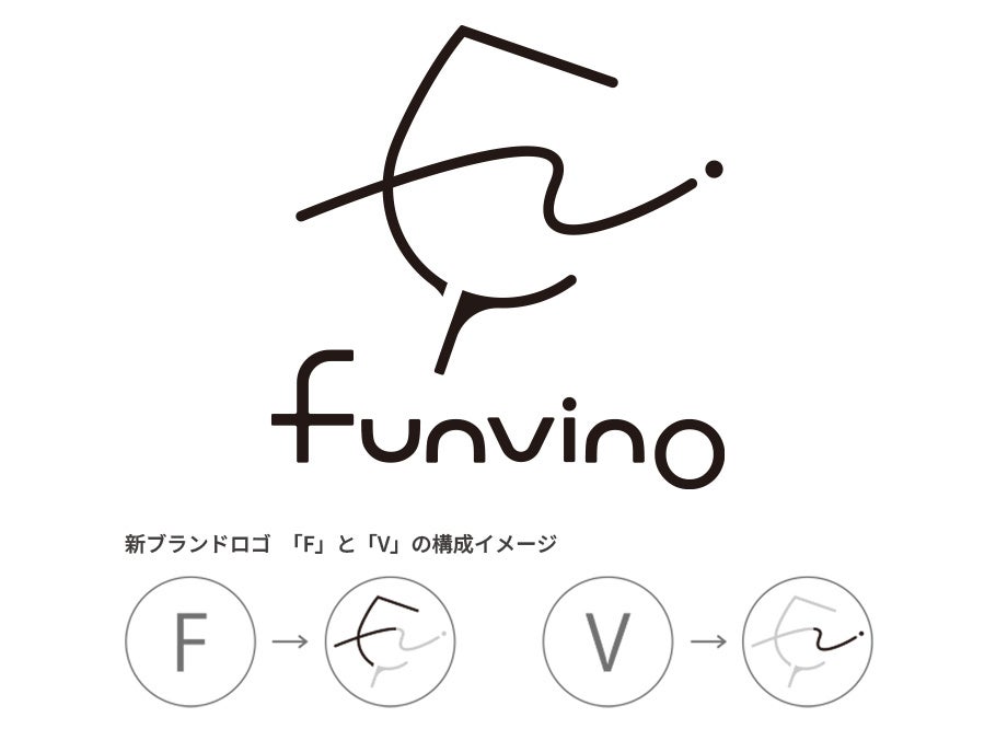 新しいブランドロゴは、ワインを楽しむ時間の心地よさや、穏やかな気持ちを表現したデザインです。 シンボルマークには、「funvino」の「F」と「V」の文字が組み込まれ、グラスを傾けた際のワインのゆらめき、ゆっくりと流れる時間や楽しさで弾む気持ちを表しています。親しみやすさと直感的な分かりやすさを大切にした、ユーザーフレンドリーなデザインです。