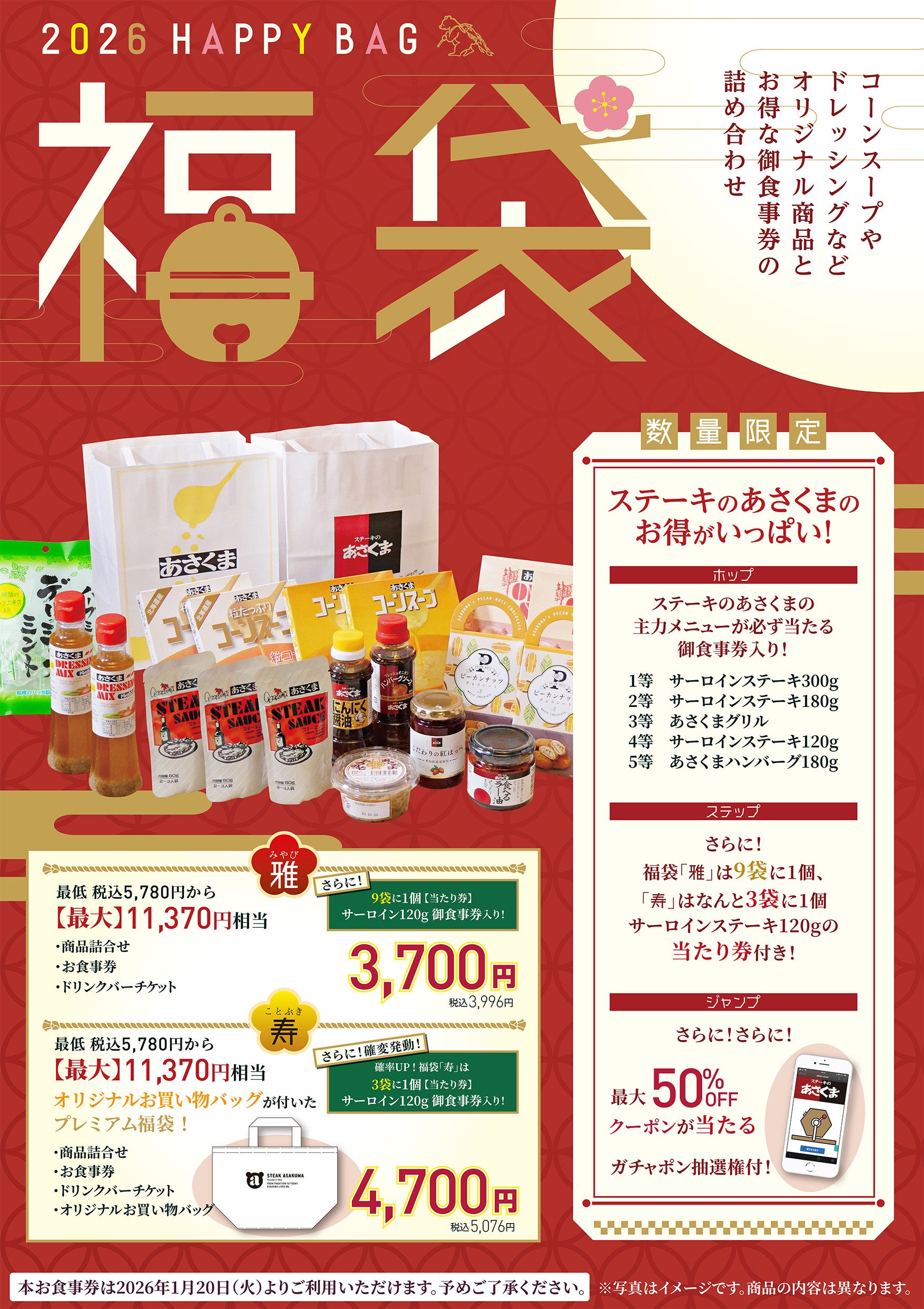 株式会社あさくま(本社:愛知県名古屋市天白区、代表取締役社長:廣田陽一)は、全国の「ステーキのあさくま」店舗にて、2026年新春企画「2026 HAPPY BAG(福袋)」を数量限定で販売いたします。