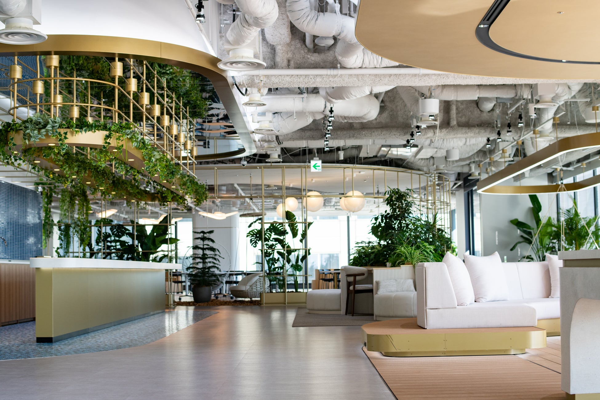 ラウンジのデザインは、「開放感」「多様性」「創造性」をテーマに、海風が届く芝浦エリアらしい抜け感と、オフィスワーカーの集中と休息を両立できる静けさを両立。高層階ならではの眺望を活かした窓際席のほか、チームで使えるソファエリアや、個人がゆっくり過ごせるカウンター席も備えています。コクヨが設計した家具や照明が、利用シーンに応じた自然な切り替えをサポートし、まさに働く人のウェルビーイングを支える空間となっています。
