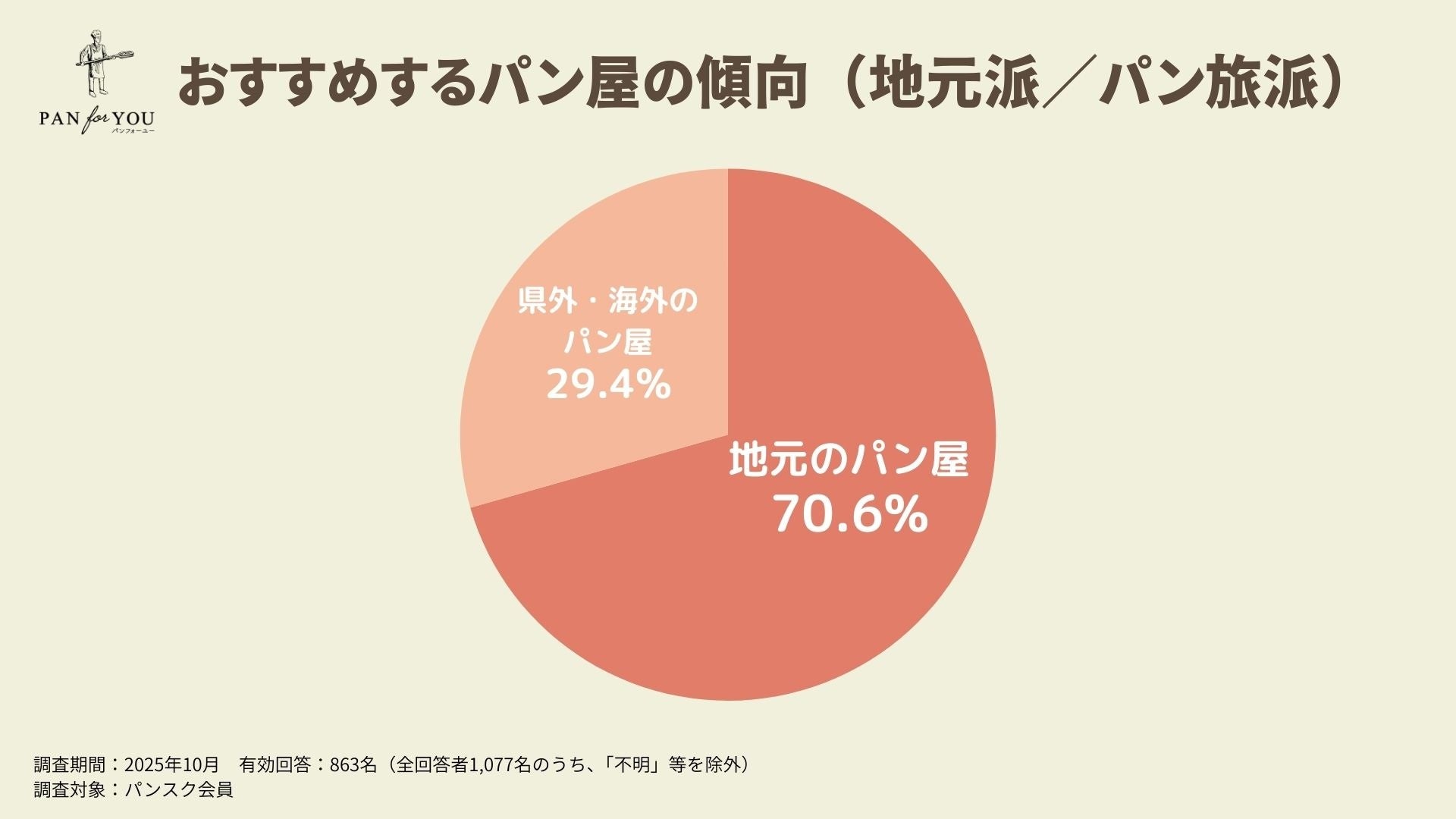 全国の約7割(70.6%)が「地元のパン屋」を推す「地元派」であり、地域に根差したパン文化の強さが確認されました。