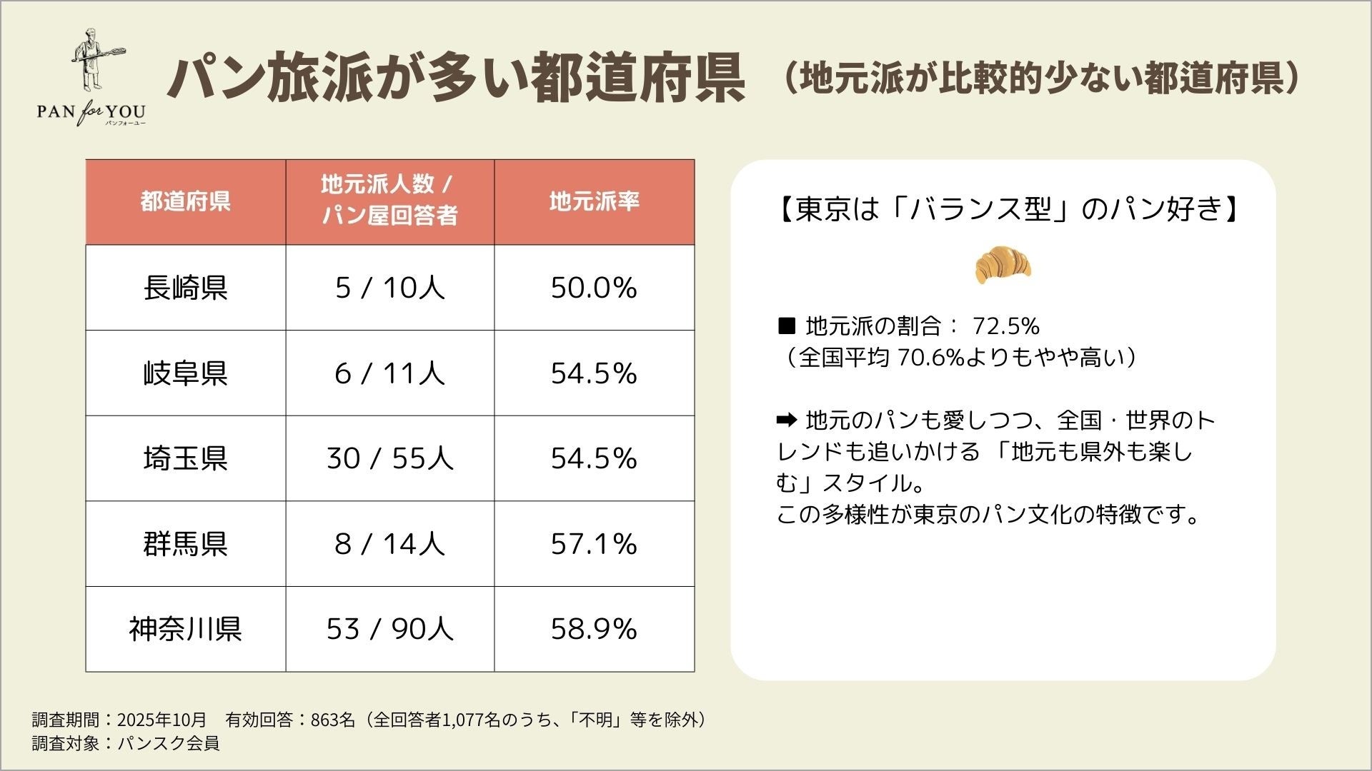 一方で、長崎県(50.0%)、埼玉県(54.5%)、神奈川県(58.9%)など、県外のパン屋も積極的に楽しむ「パン旅派」が比較的多い県も明らかになりました。