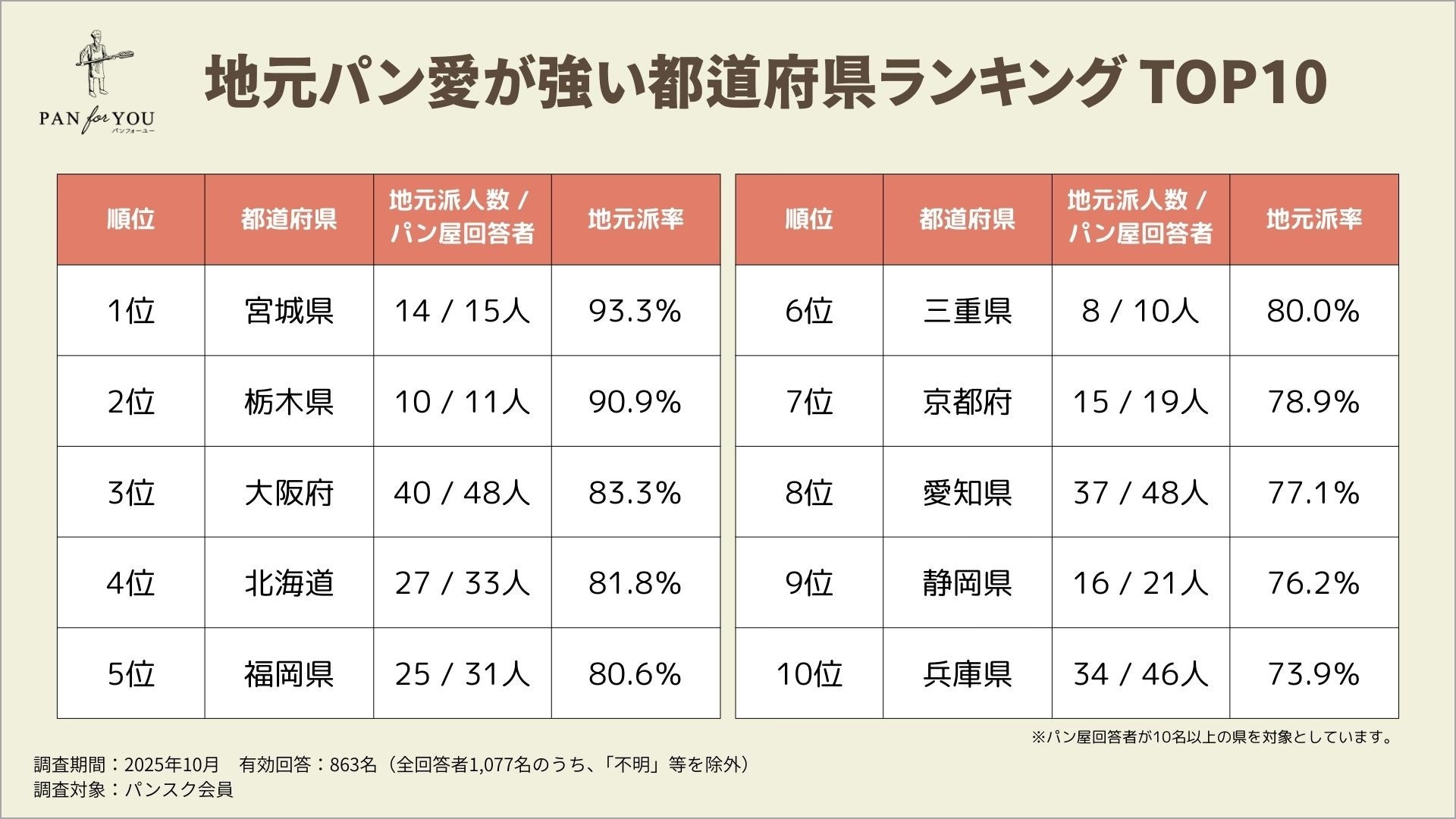 「地元パン愛」が最も強い県は宮城県(地元派率 93.3%)、次いで栃木県(90.9%)という結果になりました。