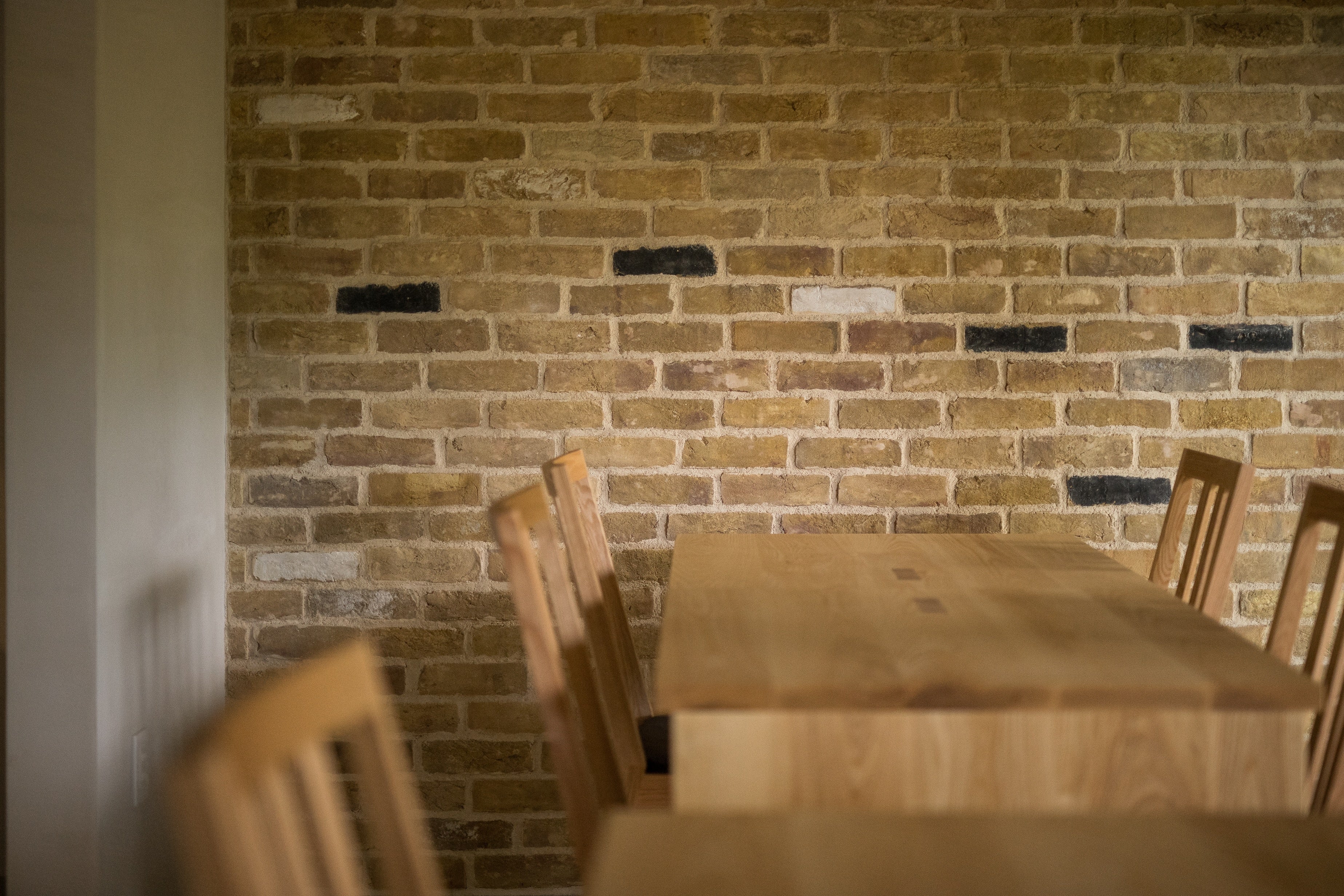 壁には、ハンドメイドのレンガをアクセントとして配置。