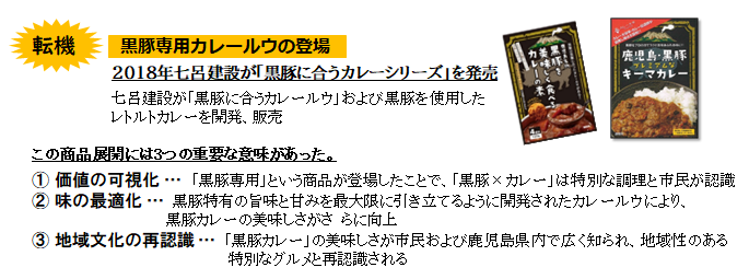 1. 価値の可視化:黒豚専用のカレールウという商品が登場したことで、「黒豚でカレーを作ること」が特別な調理法であると市民が認識するようになりました。