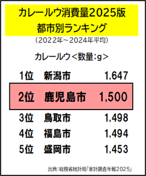 総務省の家計調査年報(2022年~2024年平均)において、鹿児島市のカレー消費量が数量ベースで全国2位、金額ベースで9位にランクインしました。
