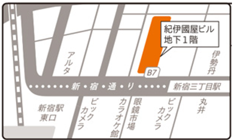 JR新宿駅東口より徒歩3分、または地下鉄丸ノ内線・副都心線・都営新宿線新宿三丁目駅B7出口 より徒歩1分(地下街より直結)