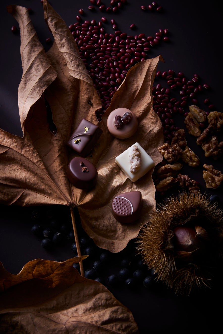 国内自給率0.1%ほどの希少な国産胡麻は、まき火で丁寧に焙煎された豊かな香りが格別。生産量日本一の茨城県で生産される「笠間の栗」は、ペーストと甘露煮を加えて上品な甘みと香りをそのまま閉じ込めたようなショコラに。今期収穫したばかりの信州くるみは、心地よい甘みと食感を活かし、丹波の黒豆は、ふっくらと炊き上げて自家製チョコレートに練り込みました。北海道産小豆のあんこを使用したガナッシュは2層仕立てにして和菓子のような仕上がりにするなど、味わい深いショコラです。