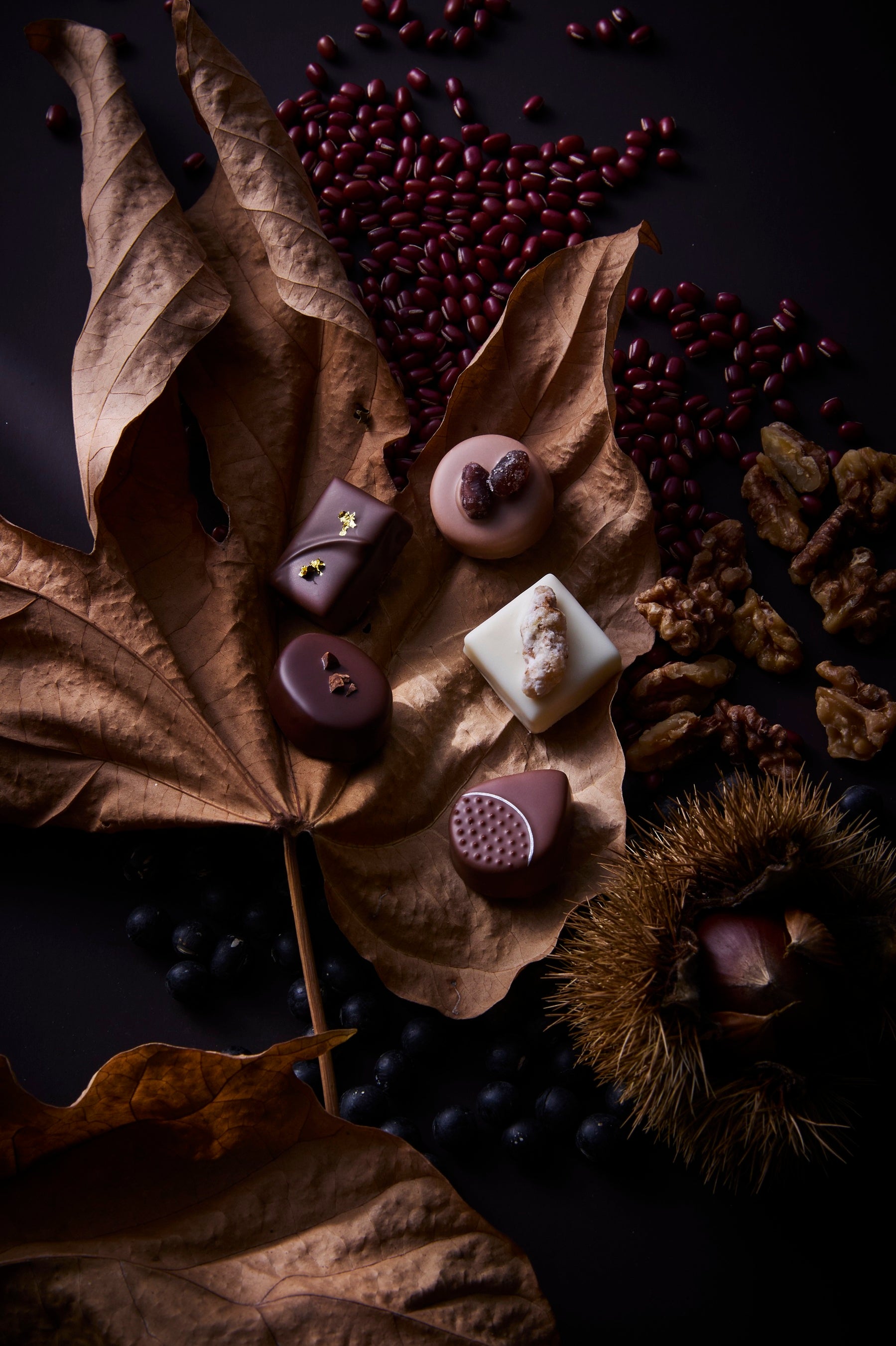 砂糖がけした胡桃や煎った黒豆のトッピング、栗や白胡麻の粒感など、食感にも趣向を凝らし、素材の味わいを引き立てたショコラで日本の実りをご堪能ください。