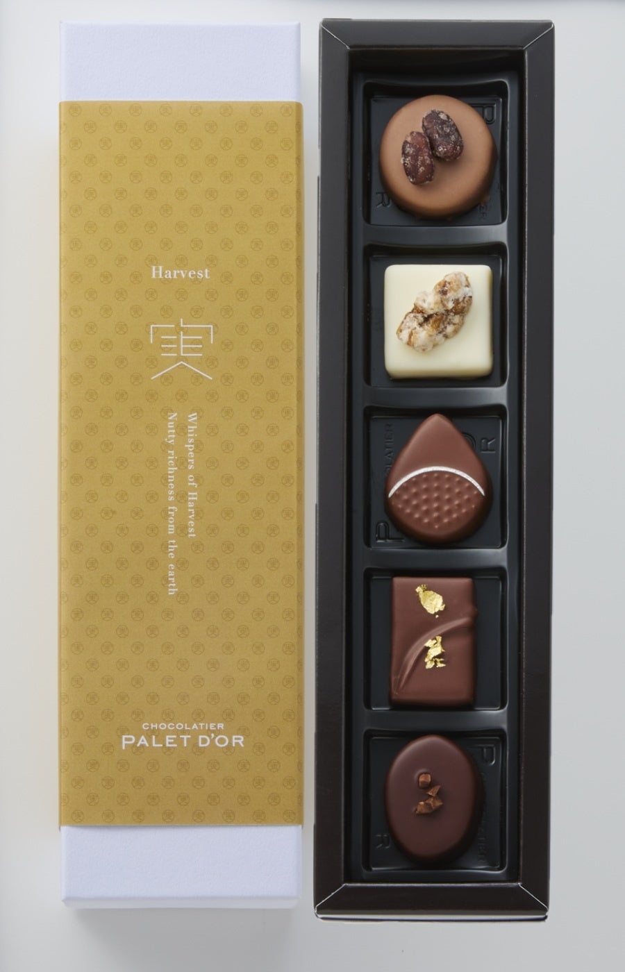 「日本のおいしさ探求」がテーマのコレクションBOX。日本各地で収穫される「実(みのり)」にスポットをあて、鹿児島県・喜界島の白胡麻、兵庫県・丹波の黒豆、北海道の小豆、茨城県・笠間の栗、長野県の信州くるみをセレクト。素材に合わせてカカオ豆から手掛ける自家製チョコレートをブレンドし、日本の風土と生産者の方々の手によって育まれる「実(みのり)」を楽しむショコラの詰め合わせに仕上げました。