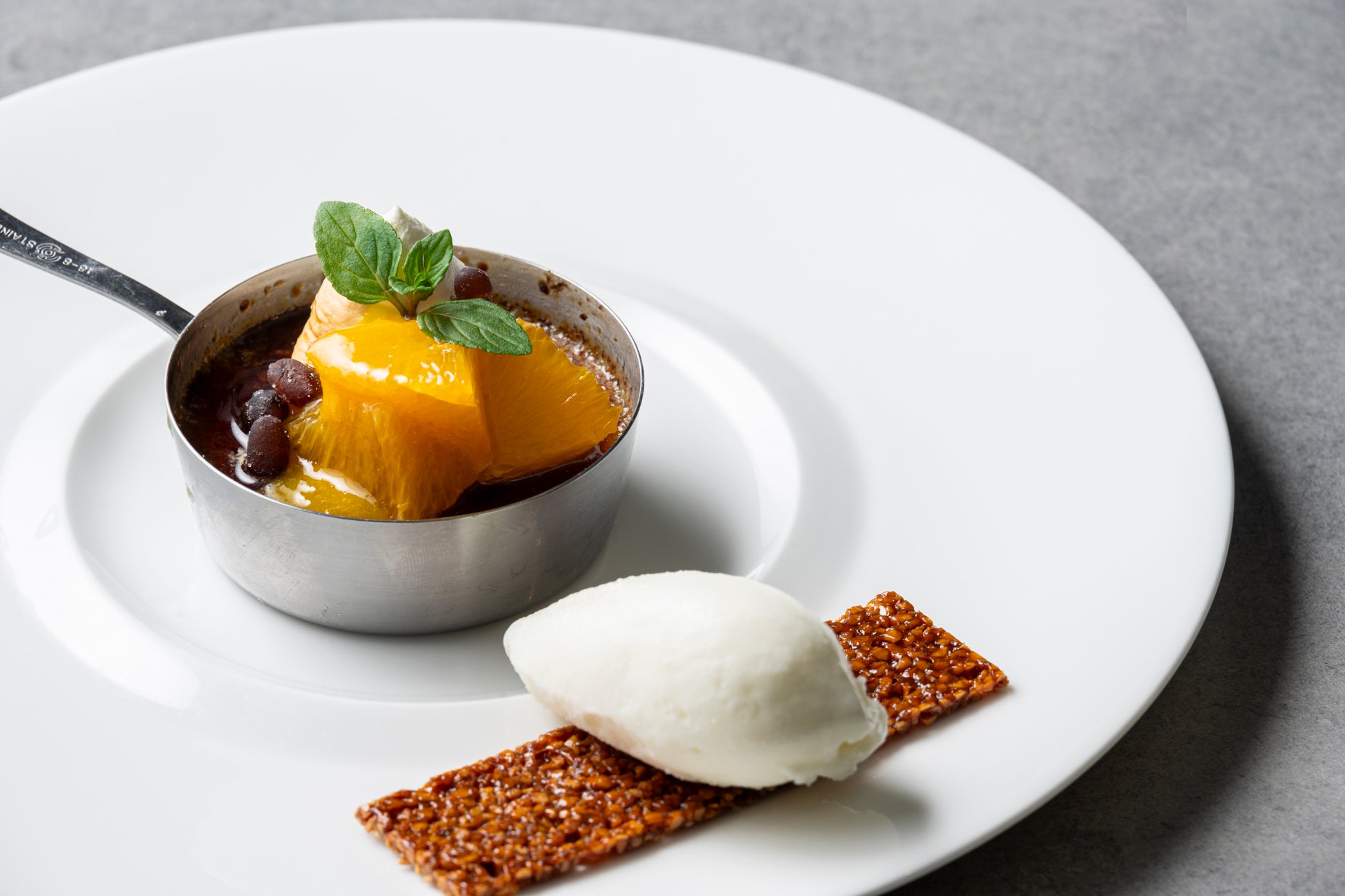 【デザート】「クレームブリュレ ほうじ茶風味 柑橘と塩ミルクアイスを添えて」