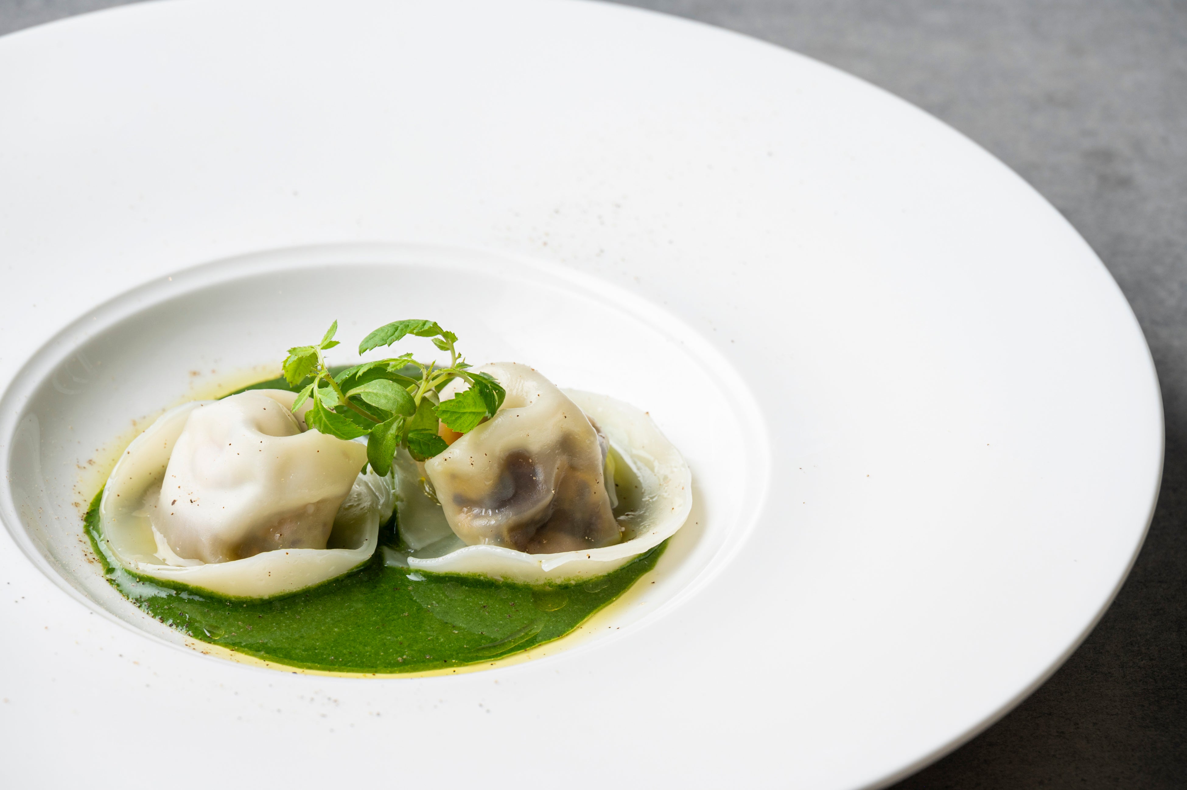 ディナーコースでは鮮やかな緑が目を引く温前菜をご用意します。もちもちの弾力のあるラビオリに包まれているのは、テール・フォアグラ・タプナード。一口含むとフォアグラの芳醇な香りとテールならではの深みのある香りが広がり、鼻孔をくすぐります。ほうれん草やマスカルポーネを合わせた緑色のソースと合わせてお楽しみいただくと、マスカルポーネチーズのコクがラビオリの味わいをより引き立てます。