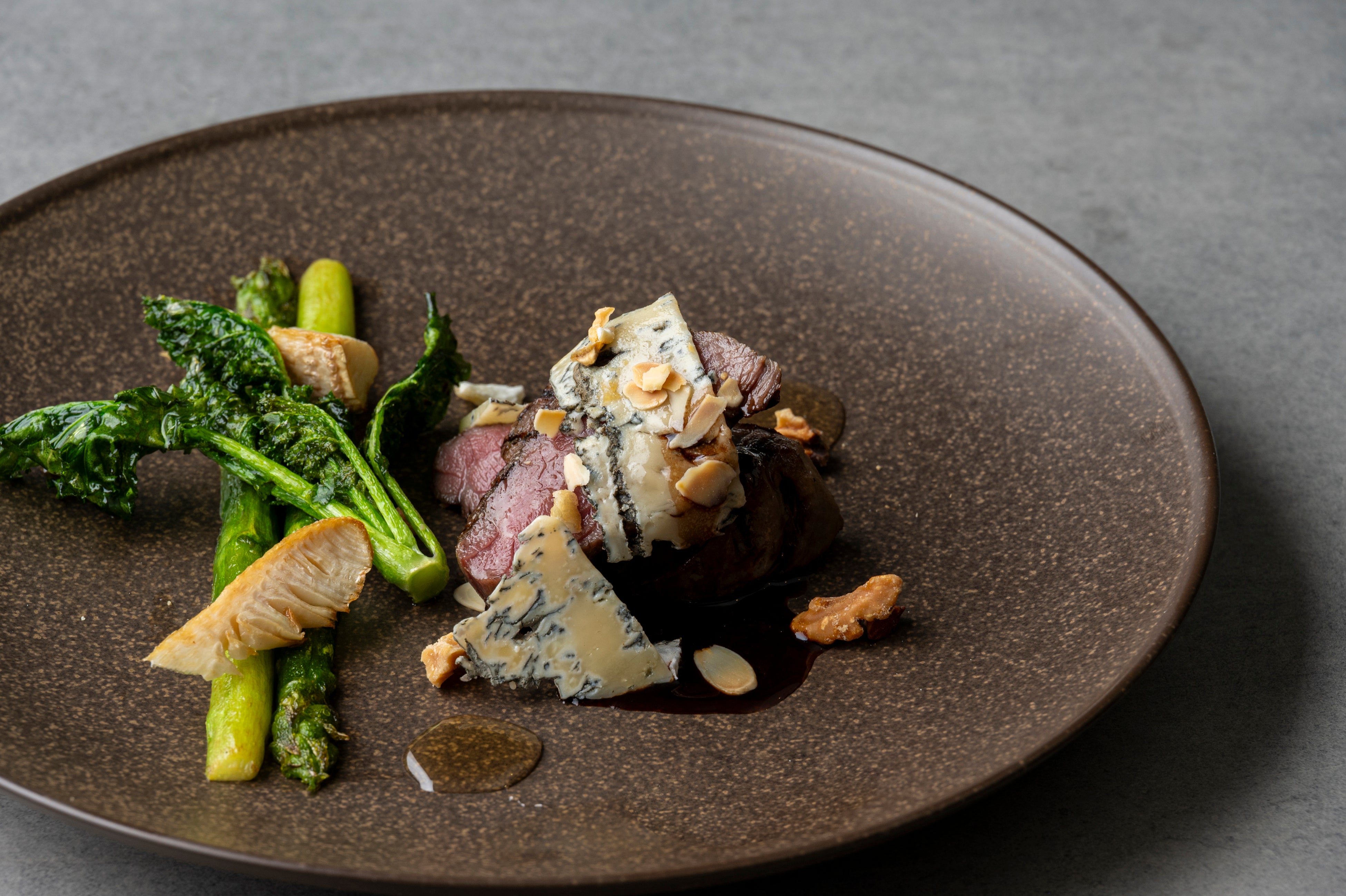 国産牛ロースのグリエ フルム・ダンベールとナッツ ヴァンルージュ