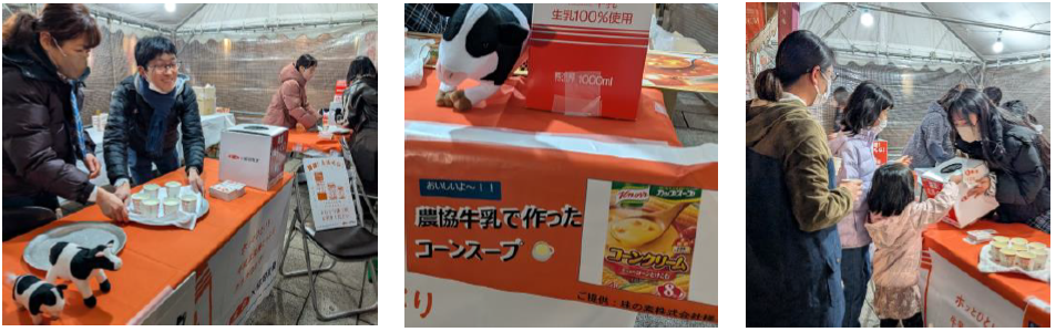 当日は農協牛乳を使用したホットミルクと、農協牛乳で作ったコーンスープのお振舞いを実施。行列で冷えた体を旬の牛乳でつくるホットミルクが温めます。