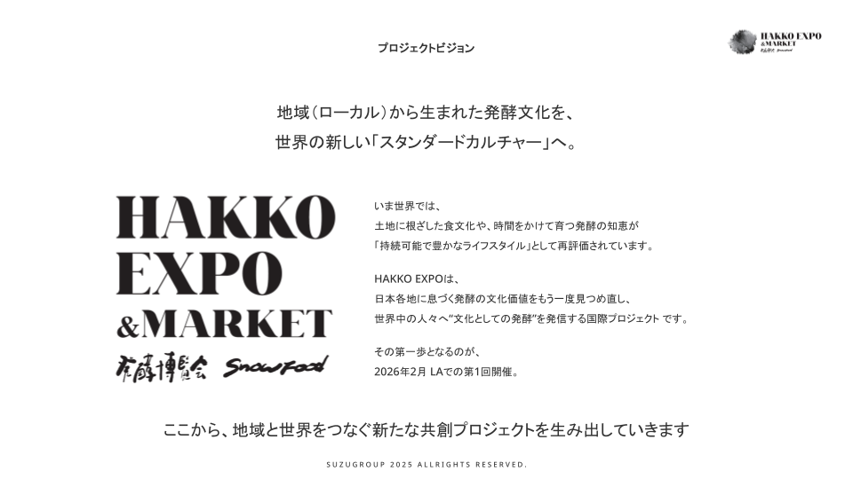有限会社寿々瀧(SUZU GROUP/本社:新潟県長岡市、代表取締役社長 鈴木 将)は、日本の発酵文化を海外へ発信するプロジェクト「HAKKO EXPO&MARKET」 の第二弾として、2026年2月21日~23日の三日間にわたって、ロサンゼルスにてオフラインイベントを開催いたします。