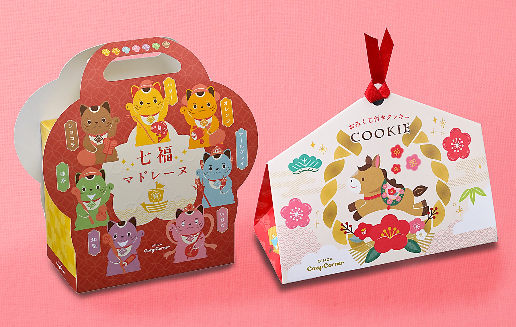 運だめしができて願いごとも書ける「おみくじ付き絵馬クッキー(10個入)」はクッキー2種を、”七福神に扮した招き猫“デザインの「七福マドレーヌバッグ(7個入)」は人気のマドレーヌ7種を、スイーツ柄ブランケットが付いた「新春福袋(28個入、グッズ付き)」はクッキー4種とマドレーヌ5種をアソートしました。