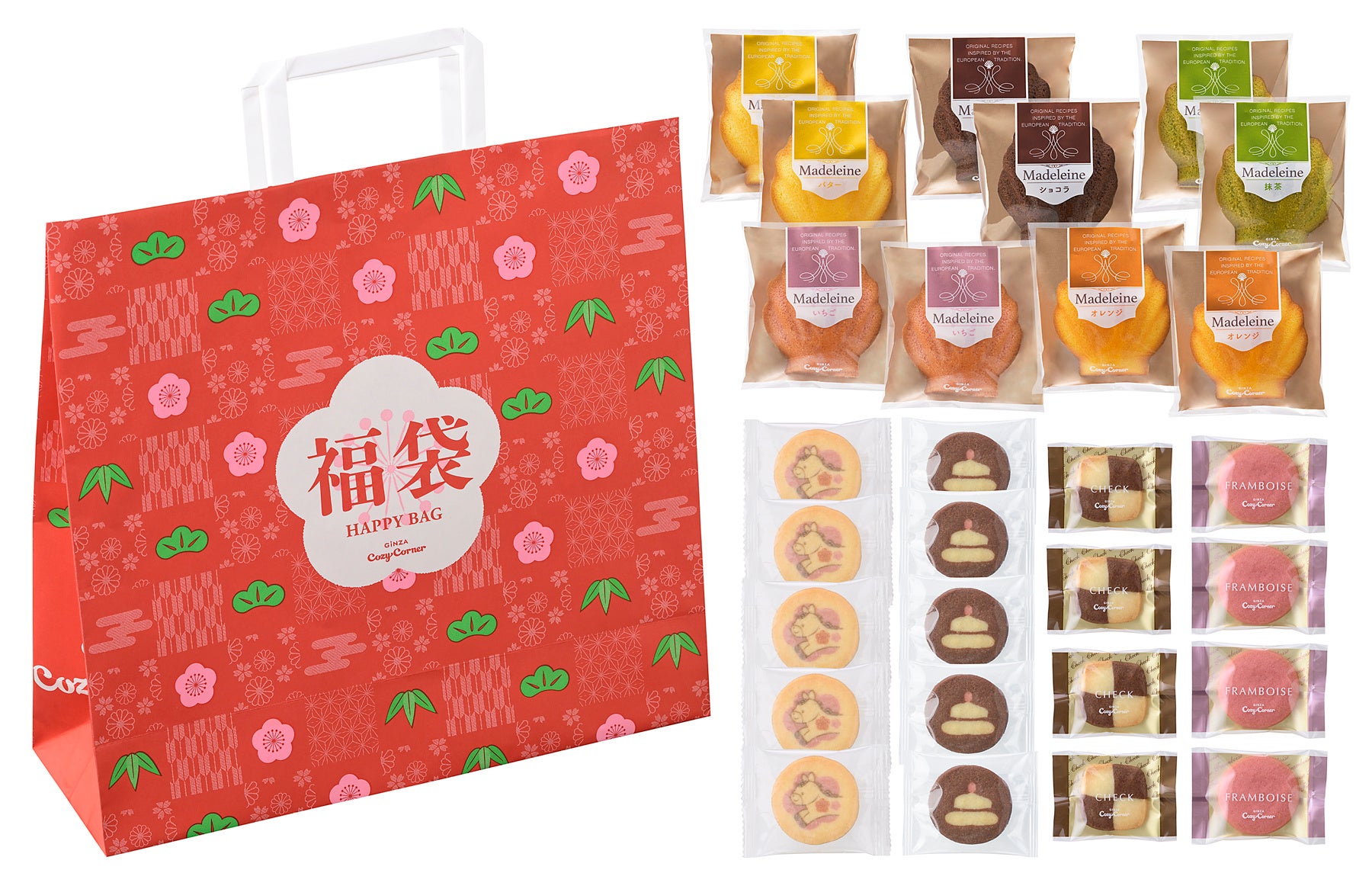 特長:銀座コージーコーナーの定番スイーツをデザインしたオリジナルブランケットが付いた、年末年始限定のお得な福袋です。干支の“午(うま)”とお正月にちなんだ“鏡餅”をデザインしたクッキーや、風味豊かに焼き上げた人気のマドレーヌ5種を詰め合わせました。ご家庭でのおやつや自分用、ちょっとした手土産に、ぜひご利用ください。