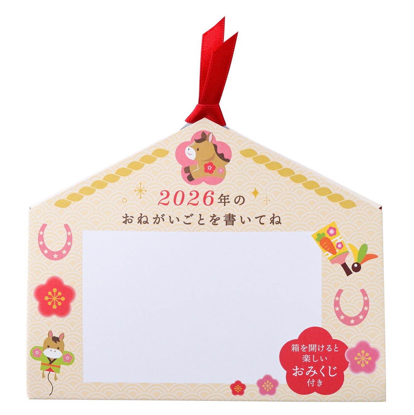 特長:干支の“午(うま)”のイラストが入った絵馬型ボックスに、お正月にちなんだ“鏡餅”と“午”をデザインしたクッキーをアソートしました。ボックス内側のツメ部分には、思わず笑みがこぼれるおみくじ付き!裏面にはお願いごとを書けるスペースが付いています。