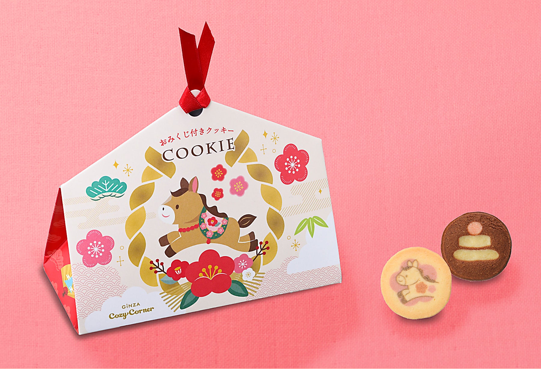 特長:干支の“午(うま)”のイラストが入った絵馬型ボックスに、お正月にちなんだ“鏡餅”と“午”をデザインしたクッキーをアソートしました。ボックス内側のツメ部分には、思わず笑みがこぼれるおみくじ付き!裏面にはお願いごとを書けるスペースが付いています。