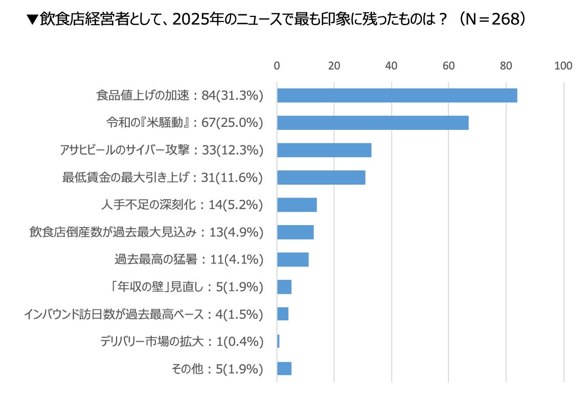 まず、2025年のニュースで最も印象に残ったものを聞いたところ、最も多かった回答は「食品値上げの加速」(31.3%)で、次いで「令和の『米騒動』」(25.0%)、「アサヒビールのサイバー攻撃」(12.3%)という結果に。「コスト」「仕入れ」といった日々の店舗運営に直結する内容が上位にランキングする結果となりました。