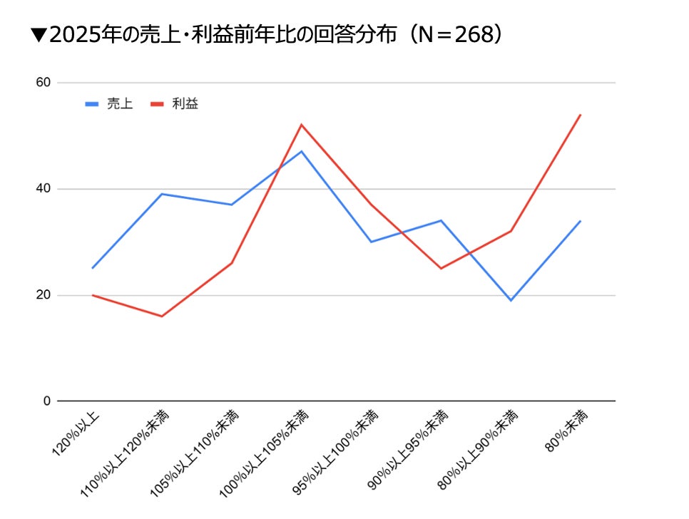 売上と利益を折れ線で⽐較すると、両者のピークの位置にズレが⽣じており、売上回復が必ずしも収益改善につながっていない状況が可視化されました。2025年は、売上動向以上に、利益確保の難しさが経営課題としてより鮮明になっていると考えられます。