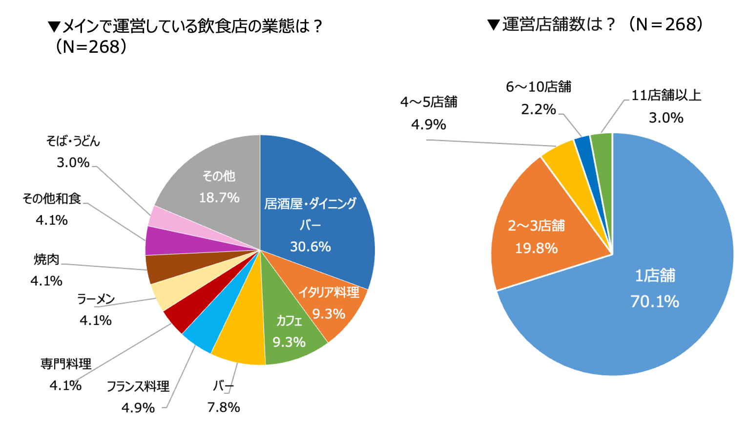 本調査にご協力いただいた回答者のうち70.1%が1店舗のみを運営しており、店舗の業態は、居酒屋・ダイニングバーを筆頭に多彩に分散しています。また、回答者のうち東京にある飲食店の割合は46.6%(首都圏の飲食店の割合は64.2%)となっており、こうした背景が結果に影響していると推測されます。
