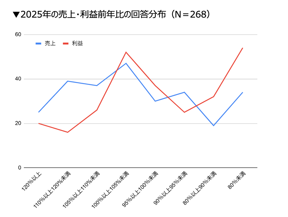 売上と利益を折れ線で⽐較すると、両者のピークの位置にズレが⽣じており、売上回復が必ずしも収益改善につながっていない状況が可視化されました。2025年は、売上動向以上に、利益確保の難しさが経営課題としてより鮮明になっていると考えられます。