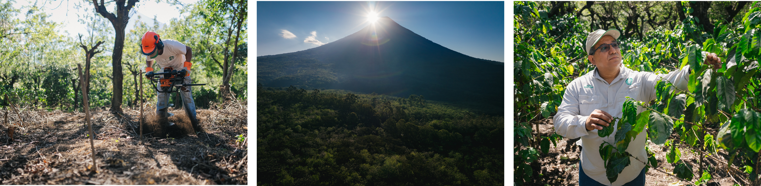 バレー オブ ボルケーノ農園は、中米グアテマラのアンティグア地方に位置し、アグア火山、フエゴ火山、アカテナンゴ火山という3つの雄大な火山に囲まれた谷に広がる農園です。北側と西側には自然保護区域が隣接しており、豊かな自然環境と寄り添いながらコーヒーを育てていく、サステナブルな栽培が求められる地域でもあります。火山性の肥沃な土壌や、標高・気候の多様性に恵まれたこの農園は、さまざまな研究や検証に取り組むための理想的な環境を備えています。