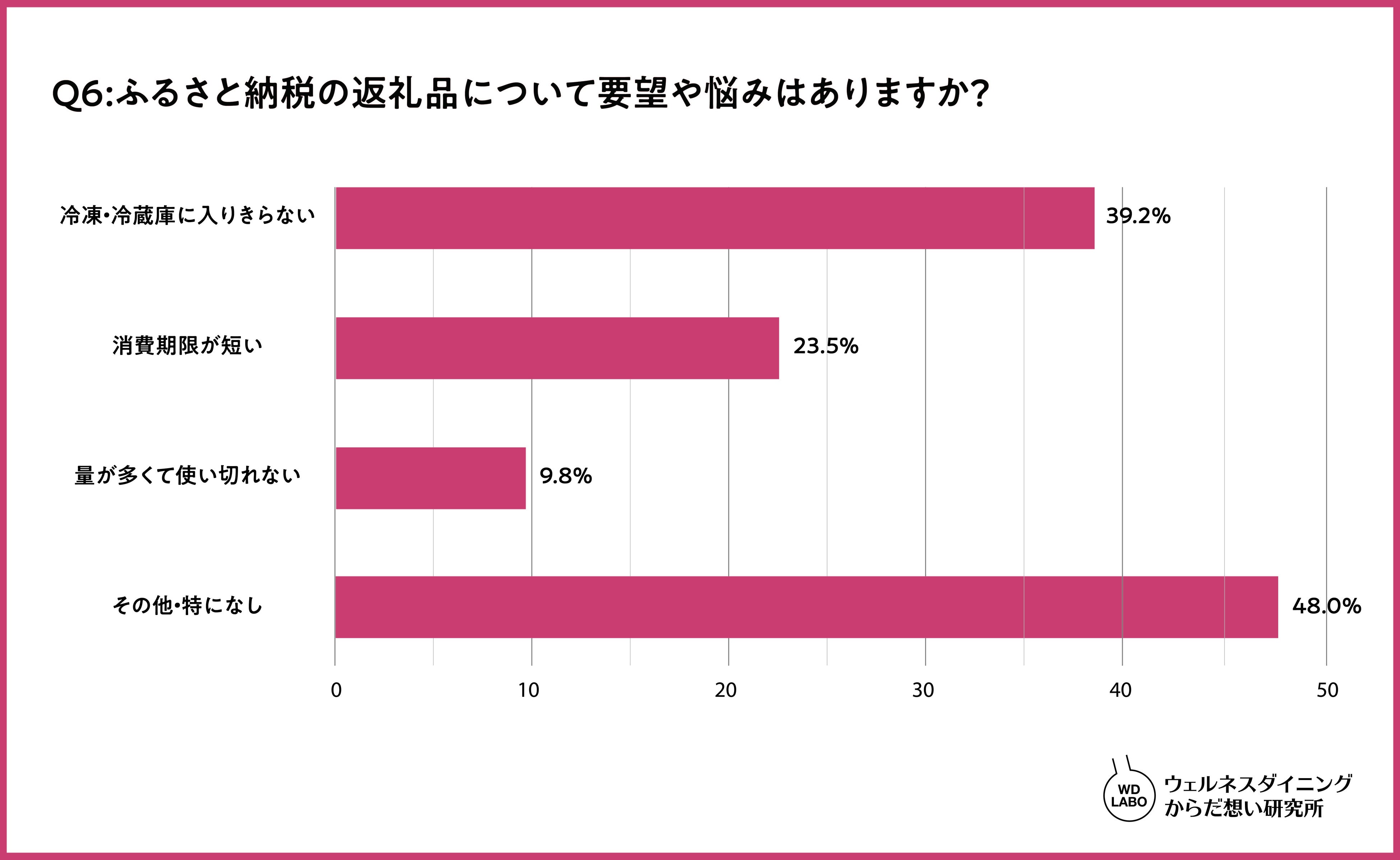 ふるさと納税の返礼品についての要望や悩みは「冷蔵・冷凍庫に入りきらない」(39.2%)が最も多く、冷蔵・冷凍庫の収納スペースの問題がふるさと納税を利用するうえで大きな懸念点になることがわかる。