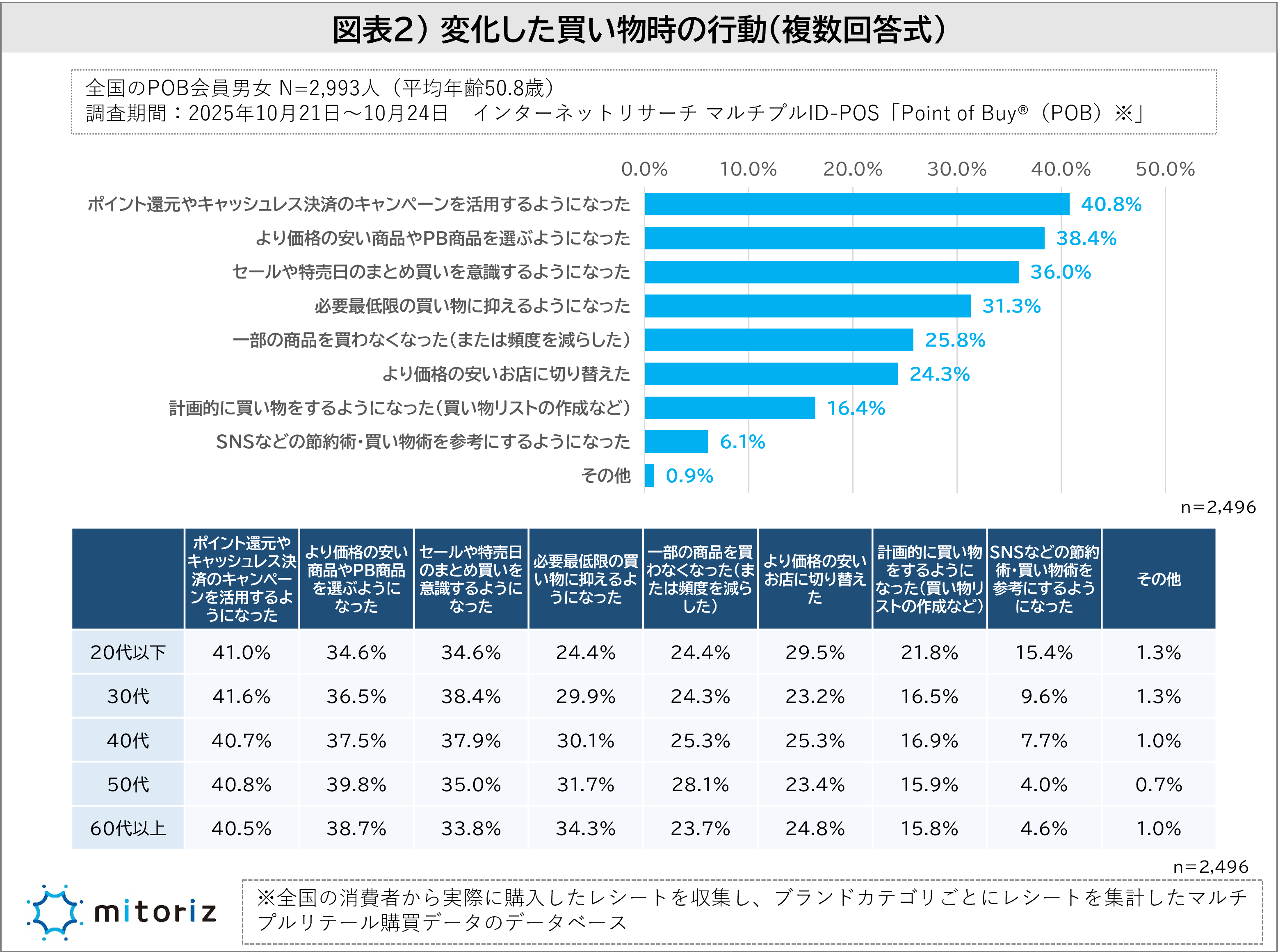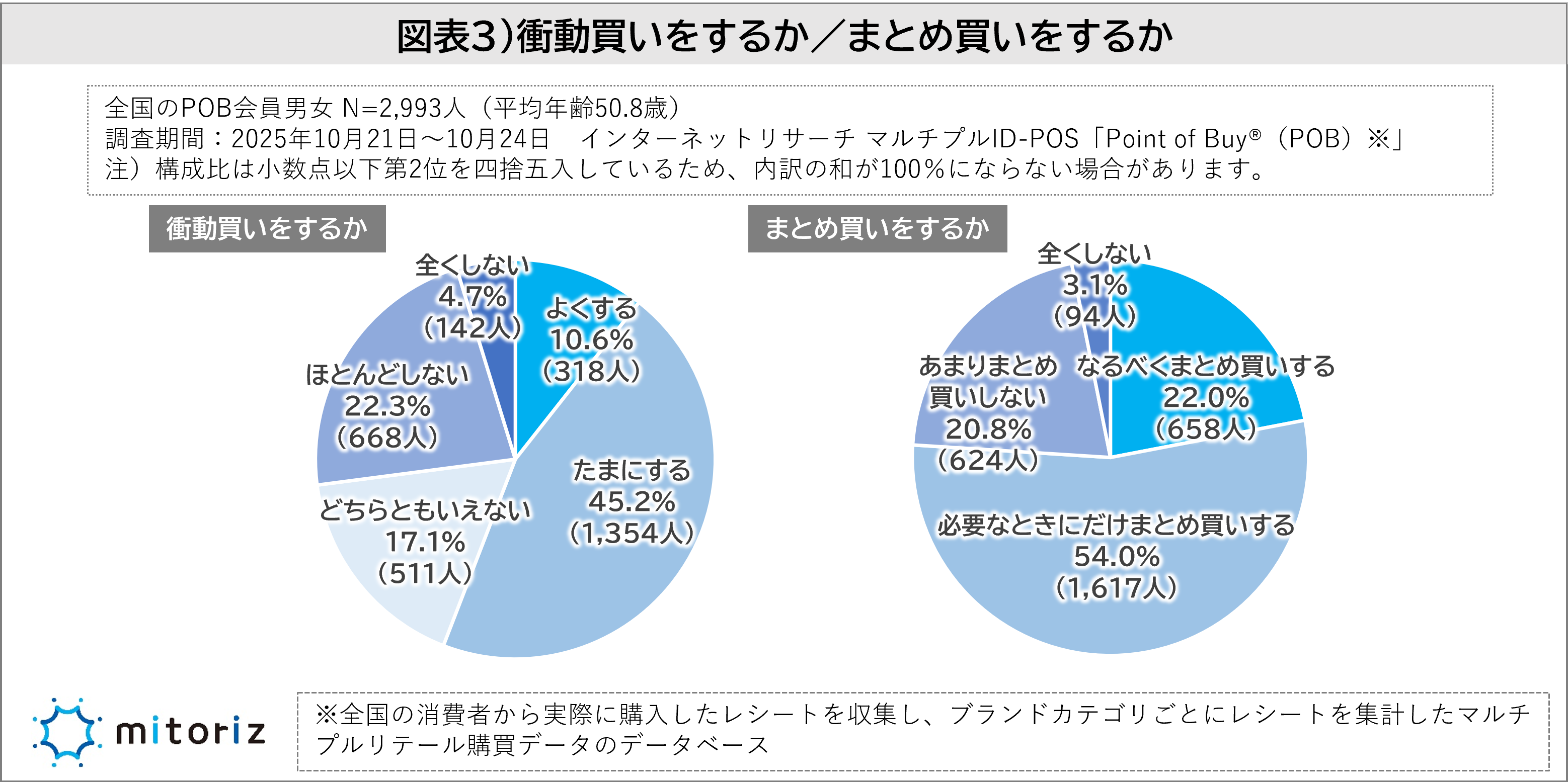 株式会社mitoriz(本社:東京都港区、代表取締役社長:原田光幸)は、消費者購買行動データサービス「Point of Buy®(以下、POB)」の会員2,993人を対象に「食品と日用品の買い物に関する調査」を実施しました。