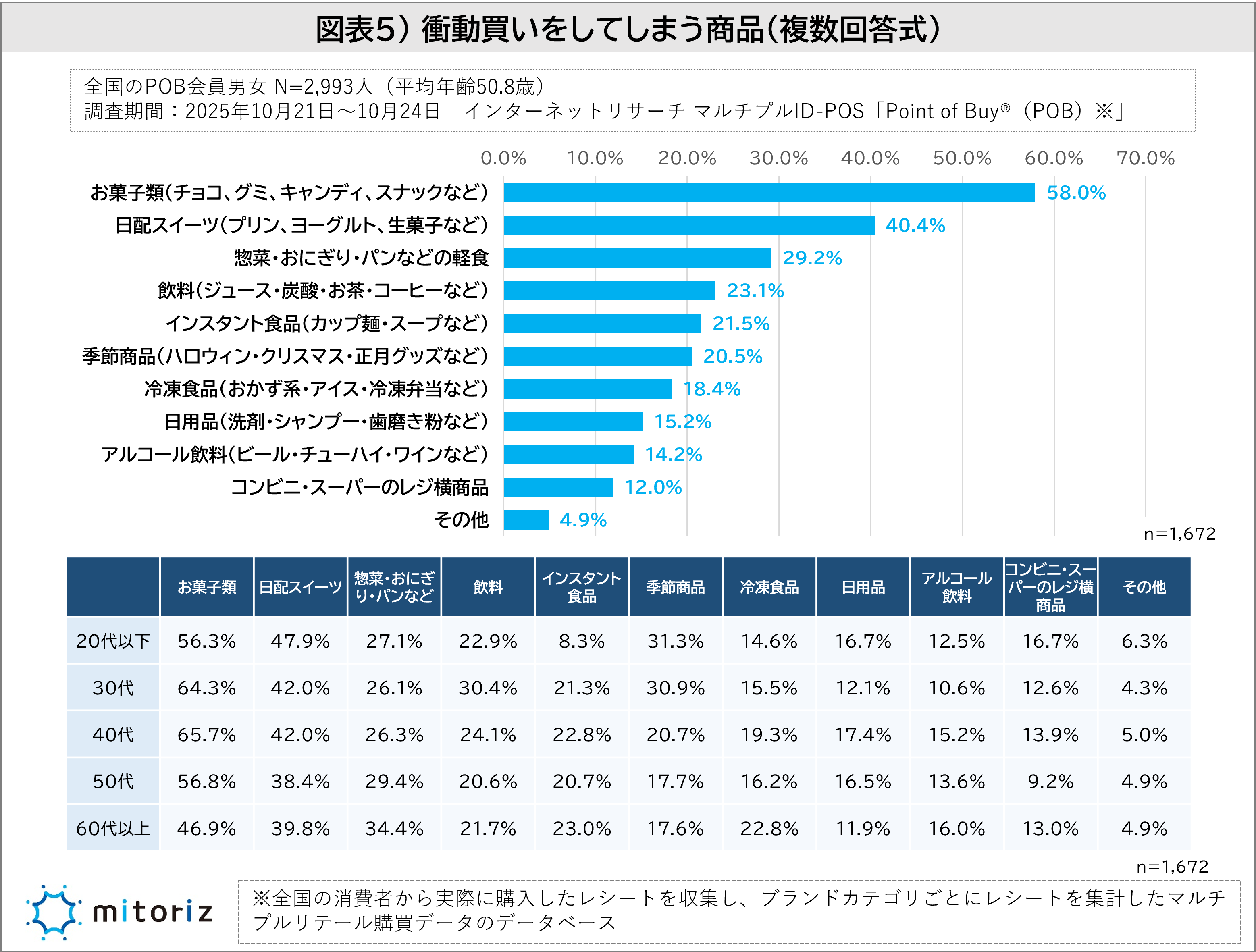 ・衝動買いしやすい商品は「お菓子類」が58.0%で最多、日配スイーツや惣菜が続く