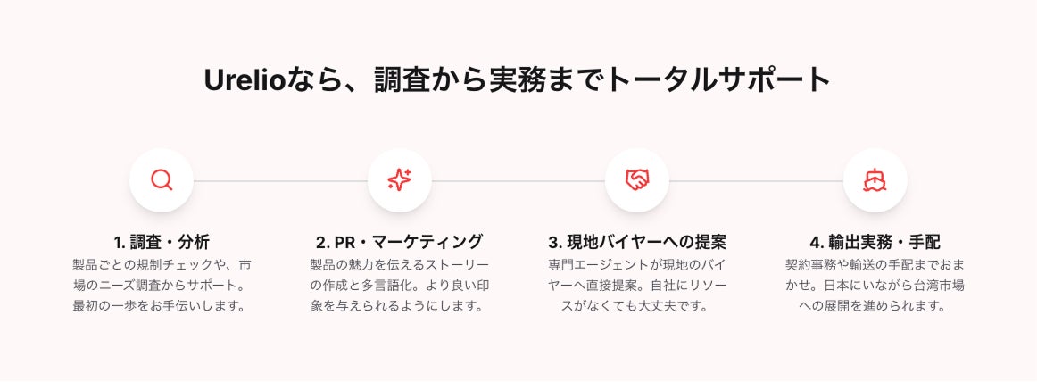規制調査・市場調査・製品PR作成といった準備段階から、現地営業提案・商談代行、契約事務、輸送手配まで、台湾市場への販路開拓に必要なすべてのプロセスを一気通貫でサポートします。