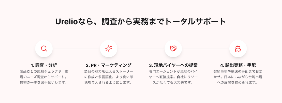 規制調査・市場調査・製品PR作成といった準備段階から、現地営業提案・商談代行、契約事務、輸送手配まで、台湾市場への販路開拓に必要なすべてのプロセスを一気通貫でサポートします。
